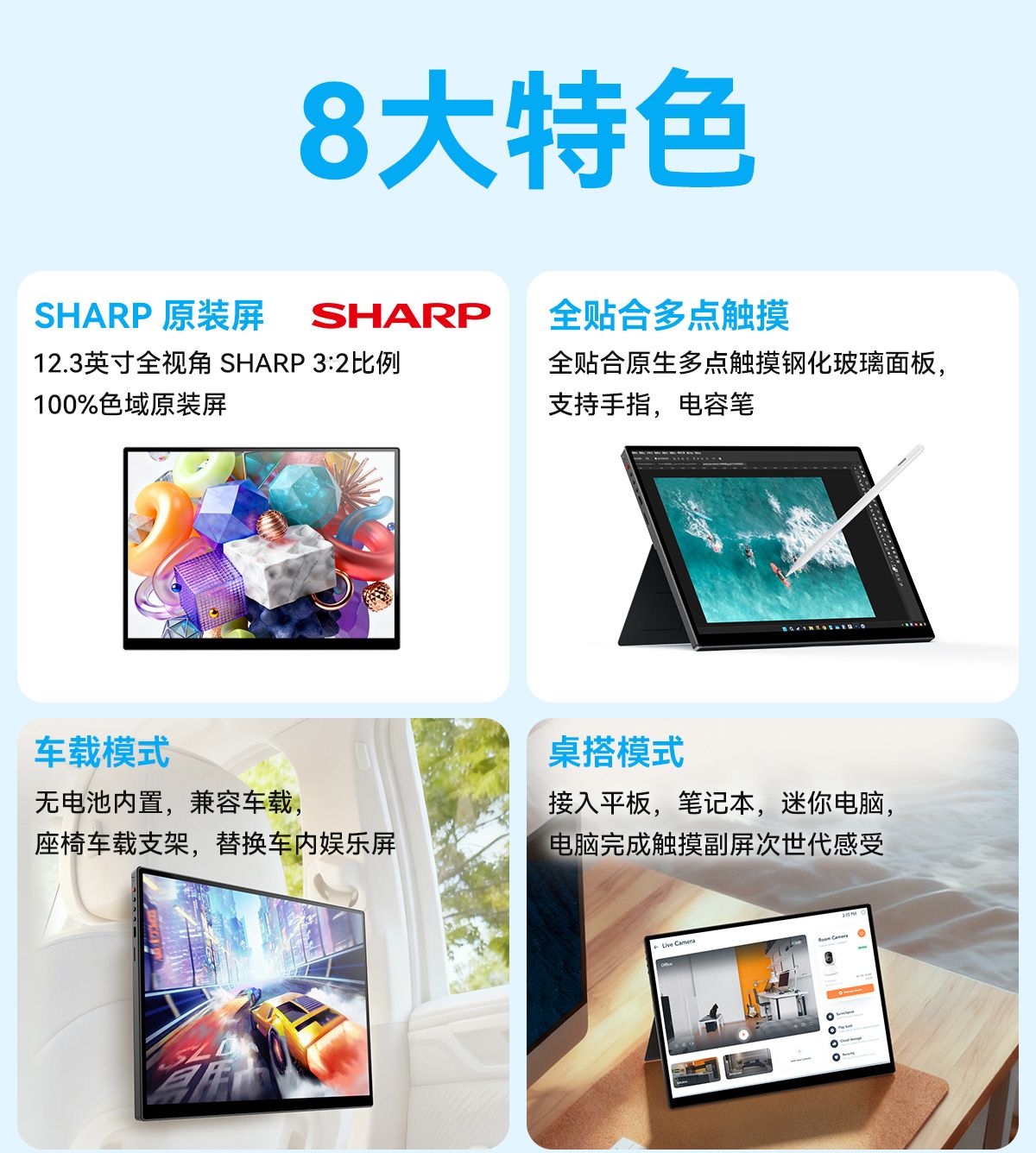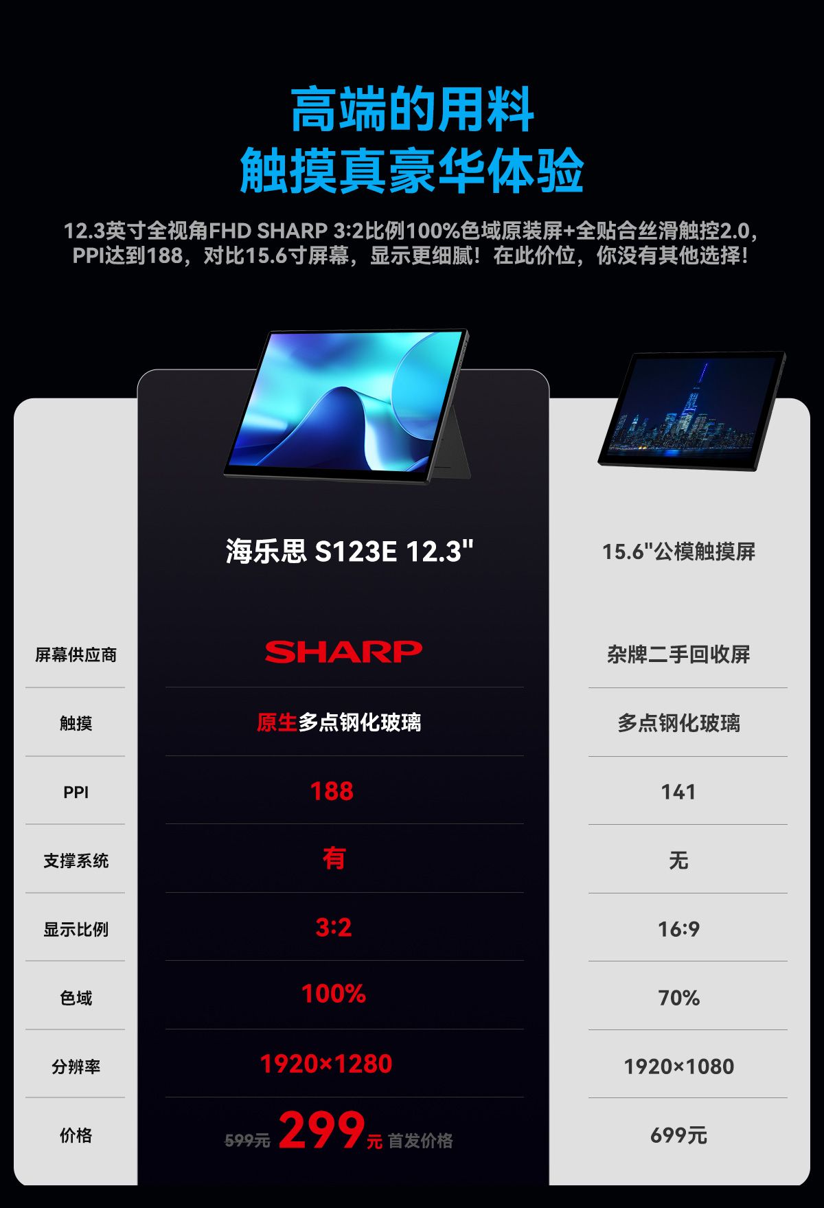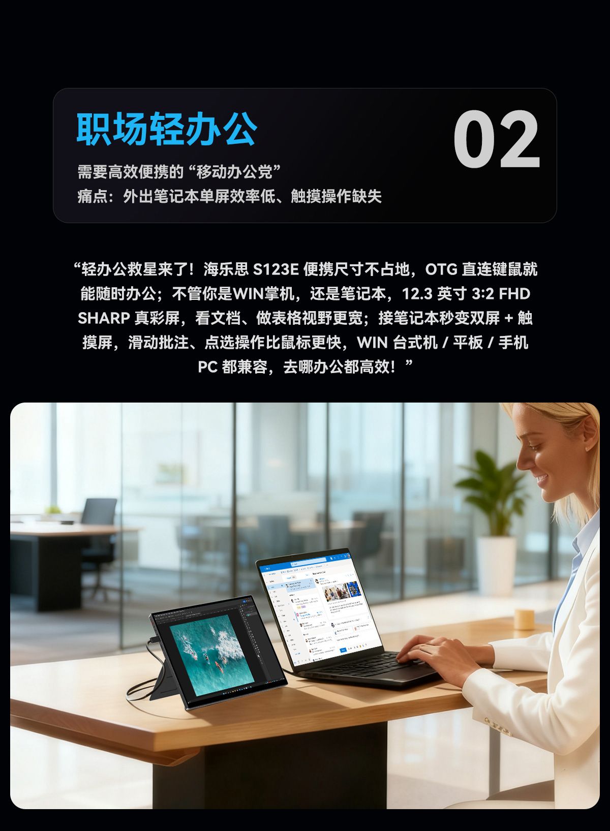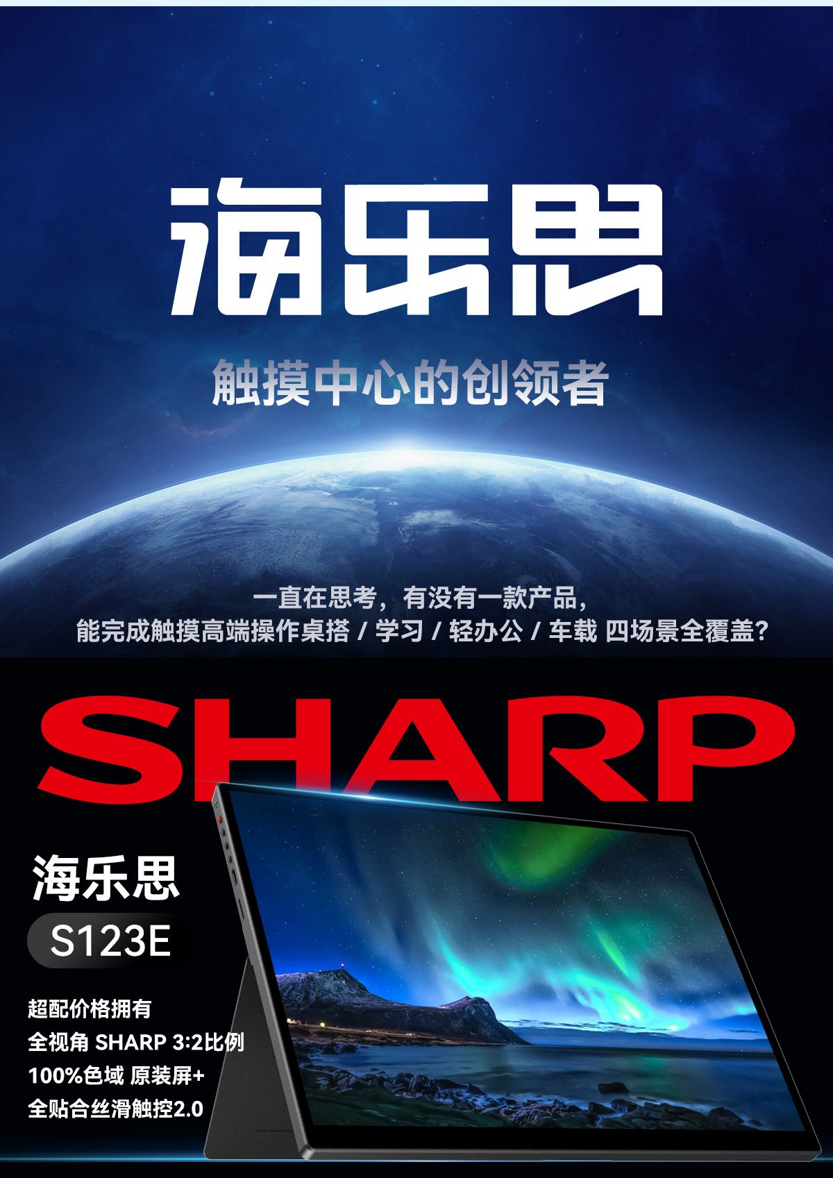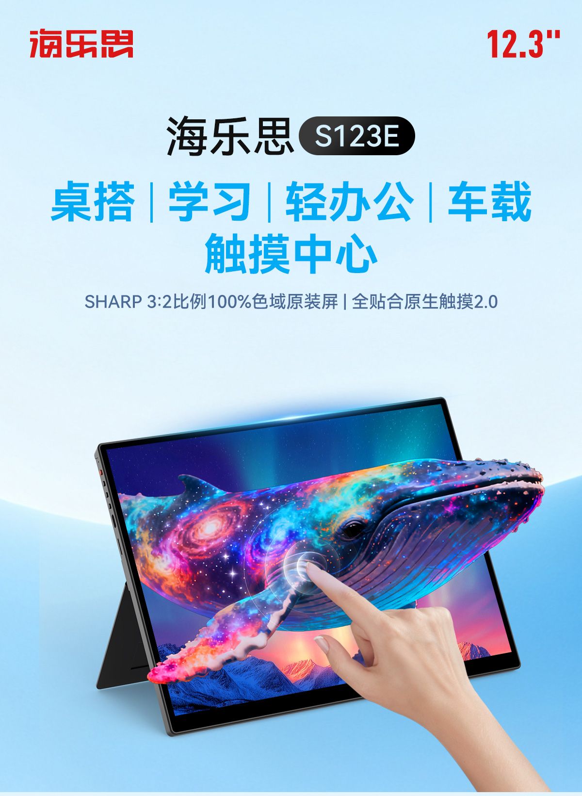 旗舰级屏幕素质: S123E搭载了一块12.3英寸的夏普(SHARP)原装LQ123N1JX34屏幕,拥有100% sRGB广色域和300nit亮度,色彩通透,显示精准。更重要的是,它采用了更适合生产力与阅读的3:2黄金显示比例,相比传统16:9屏幕,在浏览网页、处理文档时能显示更多纵向内容,效率倍增。1920x1280的分辨率使其像素密度(PPI)高达188,显示细腻度远超同级15.6英寸便携屏。丝滑全贴合触控: 屏幕采用全贴合工艺,覆盖了原生多点触控钢化玻璃面板,有效减少了空气层带来的视差和反光,触控笔尖或手指的操作点与显示内容几乎零距离,带来如丝般顺滑的书写与操控体验。它不仅支持手指触控,也完美兼容主动式电容笔。精巧设计与便携性: 机身厚度仅1厘米,重量约555克,轻薄便携。独特的隐藏式支架系统,内置阻尼金属铰链,支持无级调节,可瞬间展开并稳固悬停于任意角度。无内置电池的设计不仅减轻了重量,更使其完美兼容车载等严苛环境,无惧严寒酷暑。场景赋能:四大精准人群,一屏解决刚需海乐思S123E的核心价值在于其强大的场景适应能力,精准切入不同用户的核心痛点。