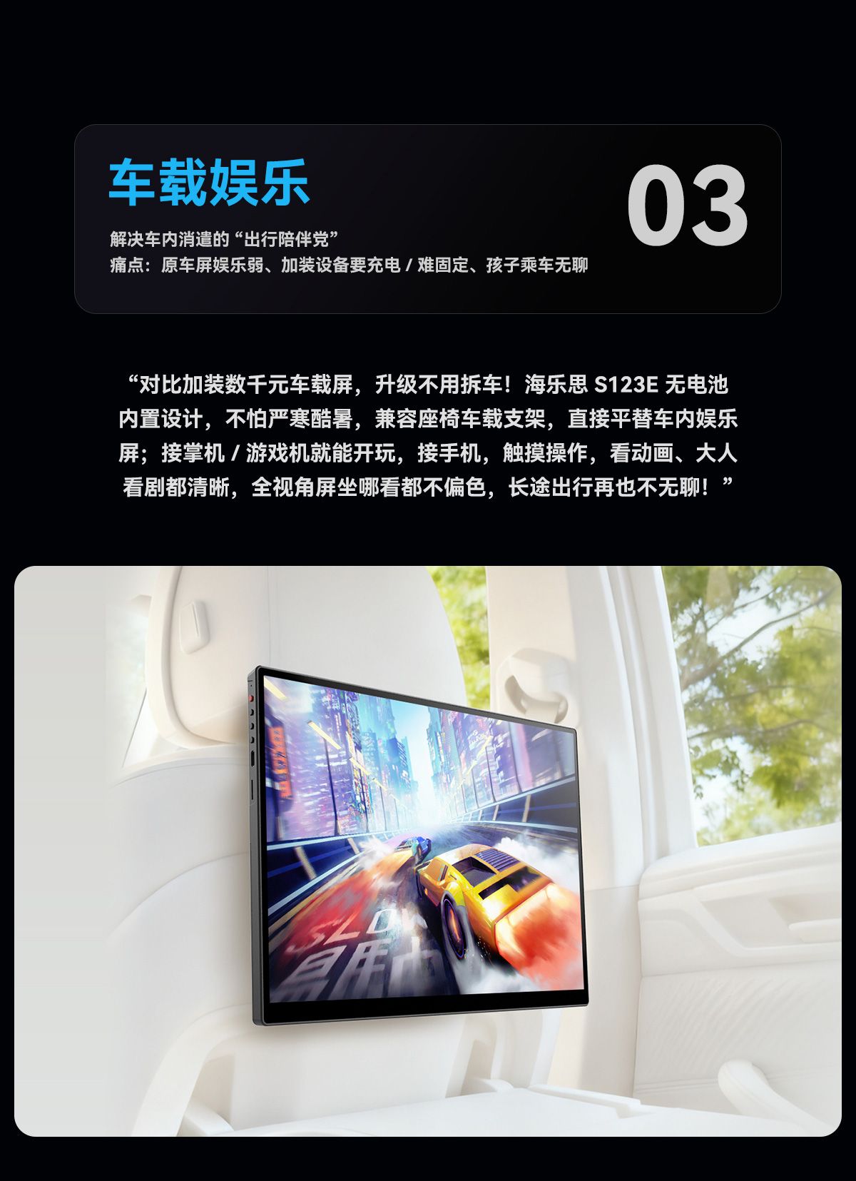 面对原车屏功能单一、加装昂贵且复杂的痛点,S123E提供了优雅的解决方案。无电池设计确保了车规级的安全性,可配合座椅支架轻松安装。连接Switch、PS5或游戏掌机,即刻变身车内娱乐大屏;连接手机,触摸操作看剧、导航,全视角屏幕让车内每位乘客都能享受清晰画质。