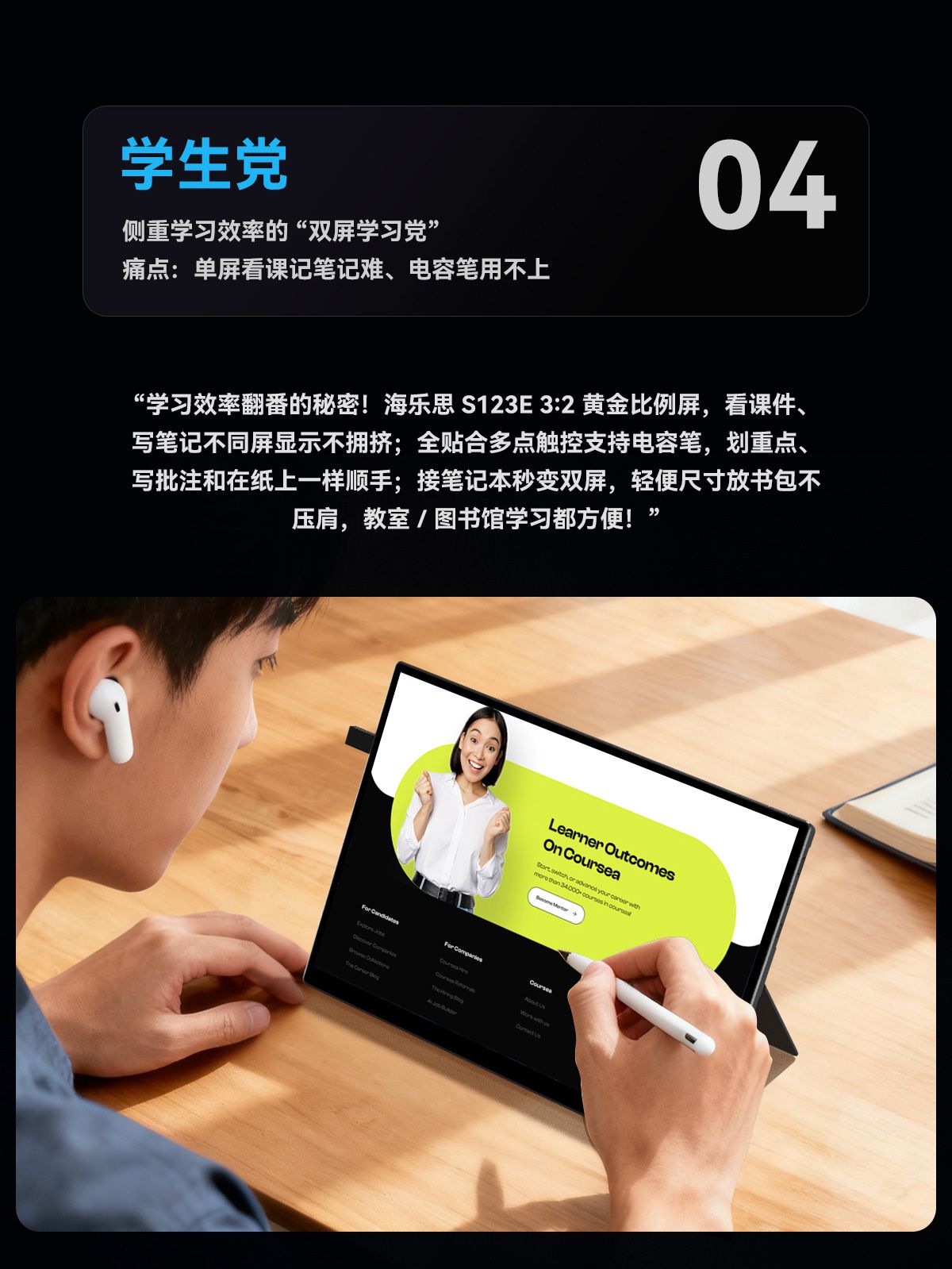 “双屏学习党”无需再为单屏看课记笔记而手忙脚乱。S123E的3:2比例屏非常适合分屏显示课件和笔记软件,全贴合触控与电容笔支持,让划重点、做批注如同在纸上书写般自然。轻薄的机身便于在教室、图书馆间携带,是提升学习效率的“秘密武器”。