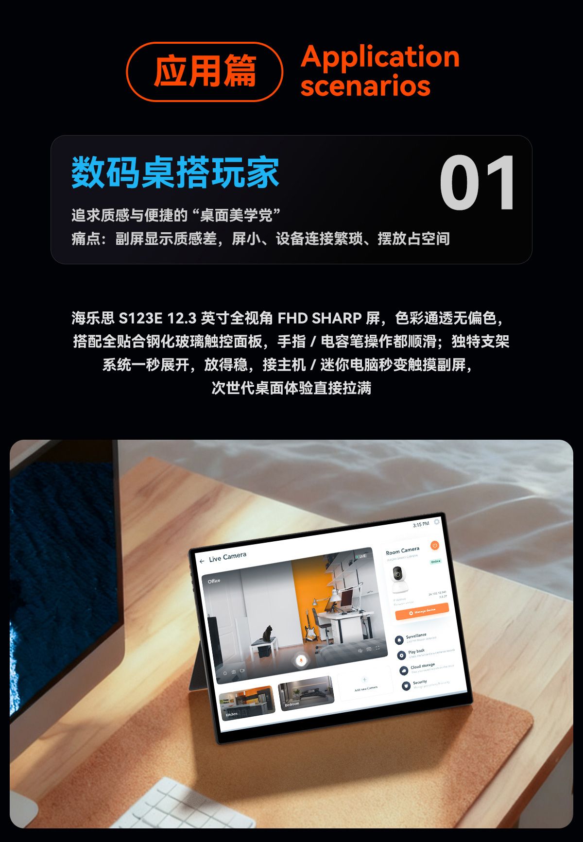 “一直在思考,有没有一款产品,能完成触摸高端操作,实现桌搭、学习、轻办公、车载四场景全覆盖?” 海乐思产品经理在发布会上表示,“S123E就是我们给出的答案。它不仅是一块便携屏,更是你桌面上的触控中枢,是连接你所有数字设备的交互中心。”