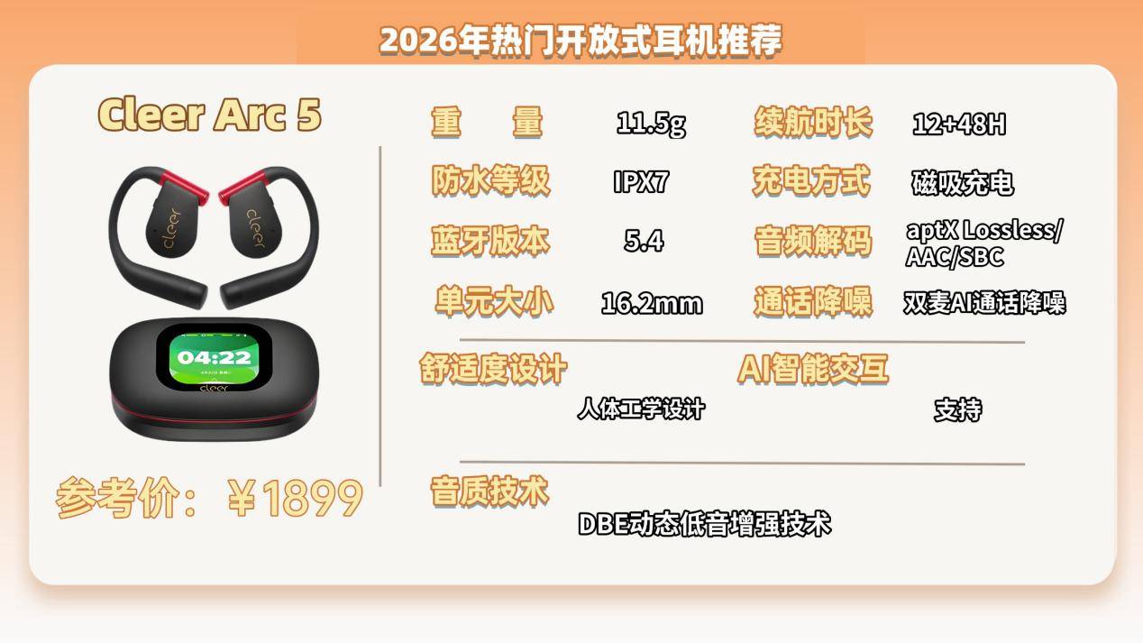 Cleer ARC 5搭载蓝牙5.4版本,做到信息传递更快、更保真。AI体感操纵2.0版本捕捉用户动作,让用户在忙碌时也能解放双手。续航方面,单次续航9h,配合充电仓可达36h,同时支持闪充模式。