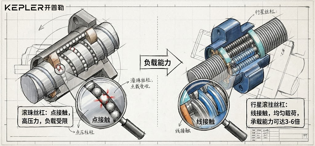 在负载能力方面,行星滚柱丝杠优势明显。其采用螺纹滚柱的线接触方式,相比滚珠丝杠的点接触具有更大的接触面积和更均匀的载荷分布,根据赫兹压力定律,其承载能力可达滚珠丝杠的3-6倍。