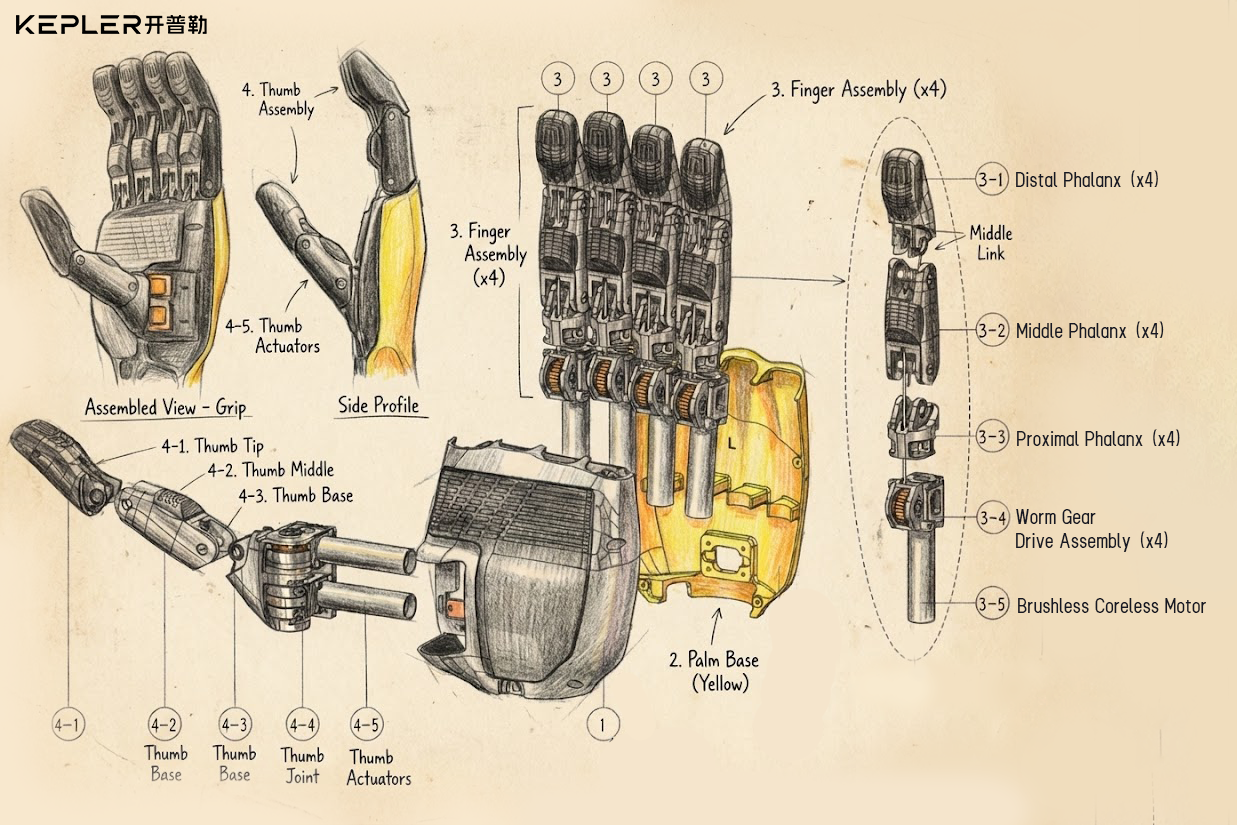 这种设计是一种面向真实工业任务的功能分工逻辑。在此基础上,开普勒机器人还自主研发了NimbleMaster巧手大师11自由度多触点灵巧手。单手套件891个零件,具备11个自由度,单指配置25个高分辨力控触点,采用高强度绳驱设计,单根绳索可承受1200N拉力,并配备手腕六维力传感器,能够出色完成高精度作业任务。既具备“大力气”,也具备完成精细操作的能力,形成完整的工业动作闭环。