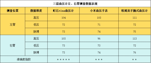 测评方法:通过测量不同位置(左臂、右臂),然后对比高压、低压、脉搏数值结果。