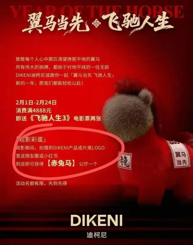 无独有偶,同样在《飞驰人生3》里怒刷存在感的男装品牌迪柯尼(DIKENI),被网友发现也搞了个活动。参与方式是观影时拍摄到DIKENI产品或者片尾LOGO,发朋友圈或小红书,就能到店领一个“赤兔马”公仔。