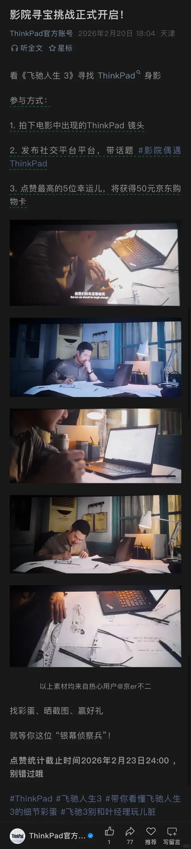 2月20号,ThinkPad的官方公众号发了篇雄文,标题是《影院寻宝挑战正式开启!》。