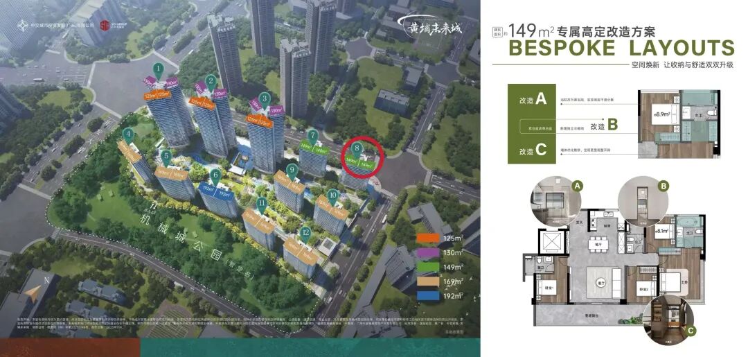 黄埔未来城,加推全新8栋149㎡户型,16层高的板楼小高层,专梯专户还带露台,总价在380-420万区间。