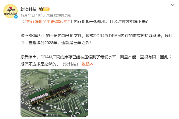 此前的行业机构预测,这轮涨价可能会持续到2026年甚至2027年。但SK海力士的一份内部分析文件,传统DDR4/5 DRAM内存的供应将持续紧张,预计会一直延续到2028年,也就是三年之后!
