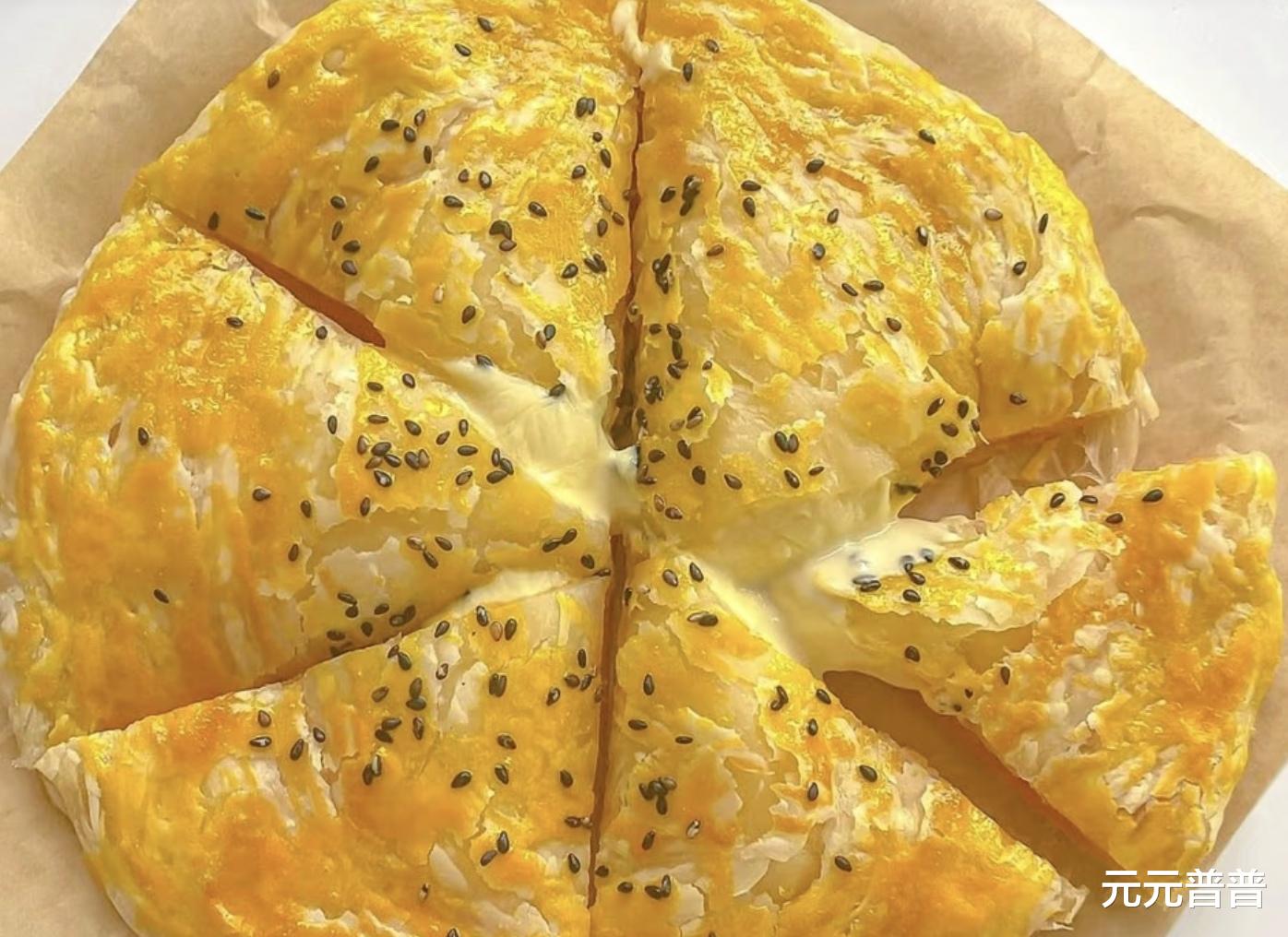 盖上另一张手抓饼,仔细捏紧边缘,表面刷上金黄的蛋黄液,撒上几粒黑芝麻作为装饰与香气的点缀。
