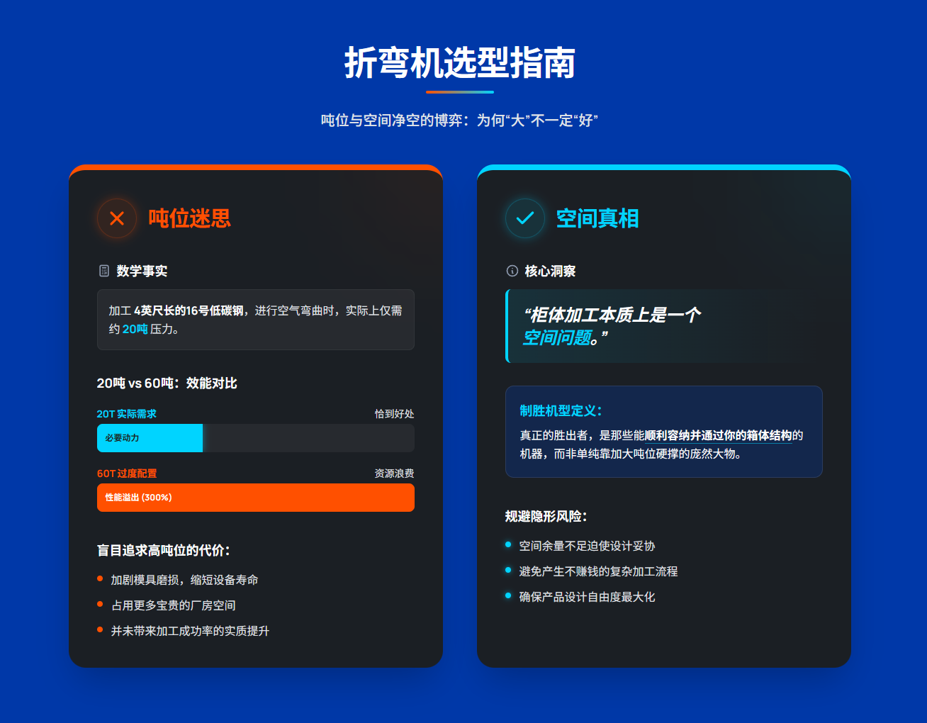 只有当折弯机的机身结构在物理上允许整个机柜工件自由移动时,数控系统、挠度补偿和伺服后挡料的功能才能真正兑现其承诺。这一洞见颠覆了旧的采购逻辑:与其计算最大材料厚度,不如计算最大机柜尺寸。运动自由度才是您首要的生产力指标。一旦您从这个角度逆向设计您的工艺,您就再也不会作茧自缚。