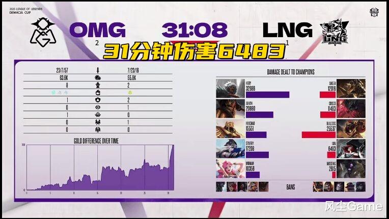 第二把的阵容,就相对正常了,但前期LNG还是劣势开局,打到中期,LNG团战操作起来了,1xn卡莎疯狂输出把比分扳平,第三把LNG又玩了一套,对后排0威胁的阵容,对线期就被打爆,1xn直接刷新伤害下限,31分钟的比赛,女枪居然打了6483的输出,比对面的辅助,还低了3K多。