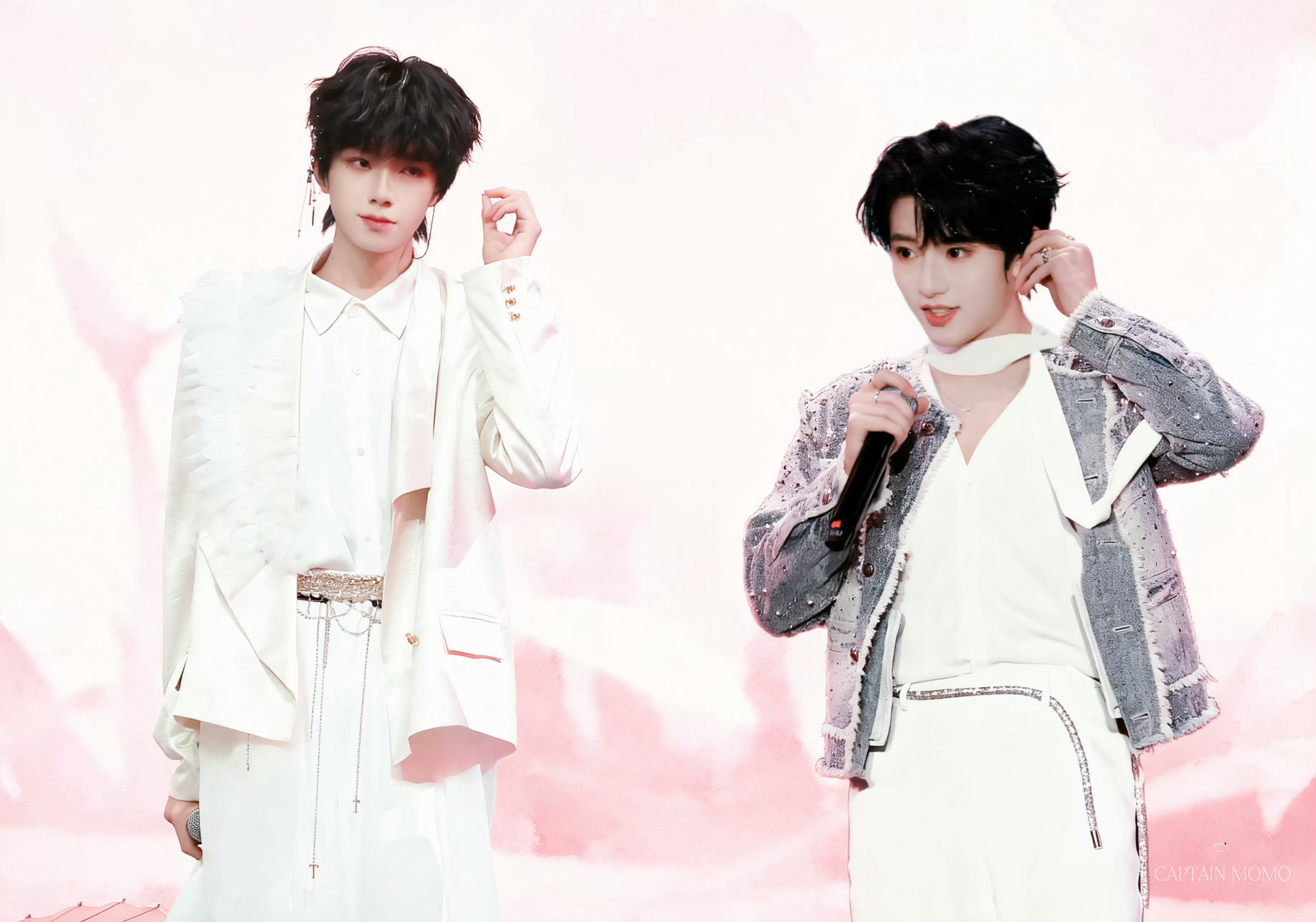 在舞台造型上,王橹杰身着一袭古风长袍,腰间系着红色腰带,头扎高发髻,英姿飒爽,气宇轩昂,宛如从古代穿越而来的剑客。穆祉丞则穿着一身黑色西装,搭配红色领带,帅气逼人,风度翩翩。两人一站在一起,古风与现代时尚完美融合,令人眼前一亮。