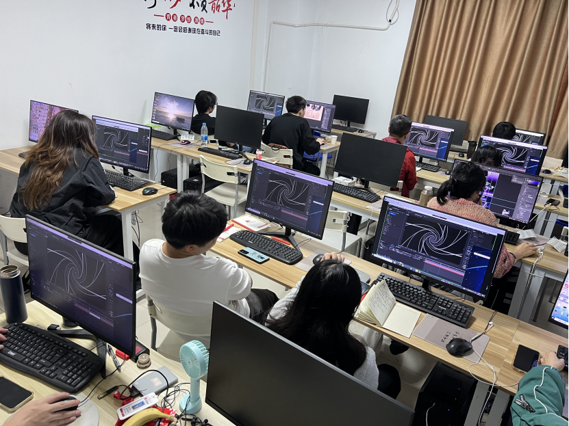 红瓜子传媒学院的教室墙上,学员的结业作品旁标注着“涉及技能:脚本策划、多机位拍摄、PR剪辑、C4D动画、AE特效、达芬奇调色”