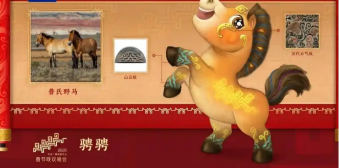 除夕夜的电视屏幕上,马年春晚吉祥物一亮相便登上热搜。这只融合了天马、火焰与传统纹样的萌物,圆滚滚的身形里藏着“马踏飞燕”的灵动,鬃毛间跃动着敦煌壁画的色彩,连尾巴上的纹路都是取自汉代青铜器的云雷纹。
