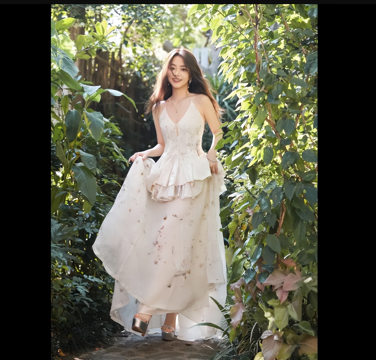 谭松韵回眸一笑,娇憨可人,少女感十足,穿白色吊带长裙性感撩人,谭松韵提着裙摆好娇俏。优雅大方,露出美背,气场超强,宛如偶像剧女主。
