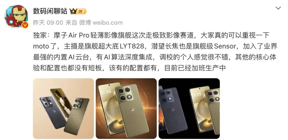 今天,这位博主的另一份消息中还提到,联想moto X70 Air Pro轻薄影像旗舰这次走极致影像赛道,主摄是旗舰超大底LYT828,潜望长焦也是旗舰级Sensor,加入了业界最强的内置AI云台,有AI算法深度集成,调校的个人感觉很不错,其他的核心体验和配置也都没有短板,该有的配置都有,目前已经加班生产中。