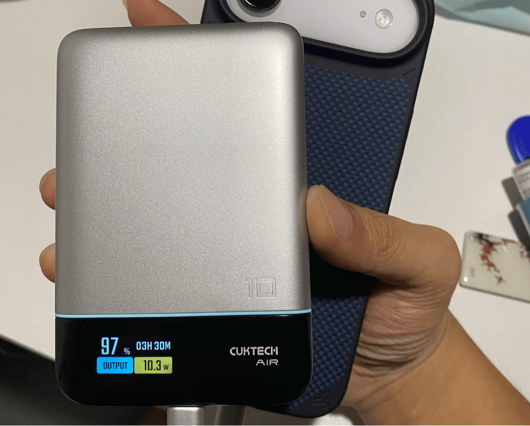酷态科10号Air配备15颗N56磁铁和液态硅胶设计,磁吸时对齐较精准,充电过程中吸附稳定性不错。支持55W有线快充和15W磁吸充电,配合TFT高清屏幕可以直观看到剩余电量和充电状态,使用上比较直观。内置可拆卸Type-C线,临时补电较为方便,但机身重量218g,厚度相对较大,放入口袋时略显笨重。磁吸线圈面积偏小,快速移动或走路时可能会轻微晃动。续航上,由于内置硅碳负极电池容量有限,长时间外出可能需要多次补电。实际体验中,磁吸功能可靠,但便携性和续航表现是相对折中的方面。