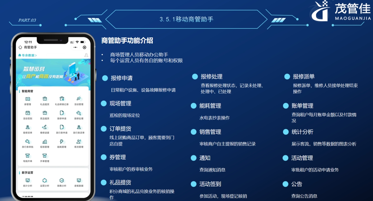 协同不畅、沟通受阻,是制约百货商场运营效率的重要因素。茂管佳商户商管助手系统以数字化协同沟通平台为核心,打破部门壁垒、连接商场与商户,实现信息实时共享、工作高效联动、应急快速响应,全方位提升商管协同效率。冬余数据科技深耕行业,深知商管工作的繁琐与痛点,致力于通过技术创新为商场减负、赋能。如果你的商场正被沟通成本高、协同效率低、应急响应慢等问题困扰,不妨选择茂管佳,让协同沟通更顺畅,商管工作更轻松。