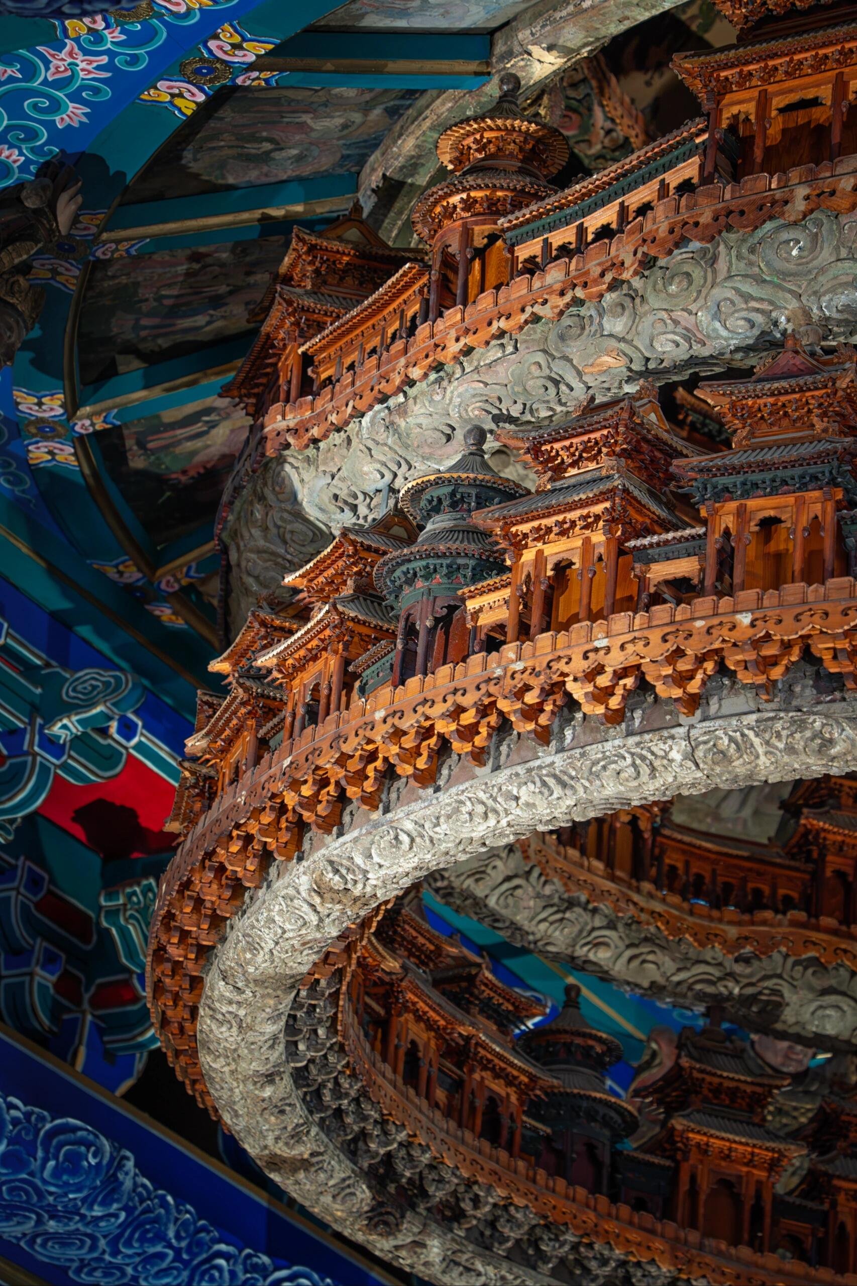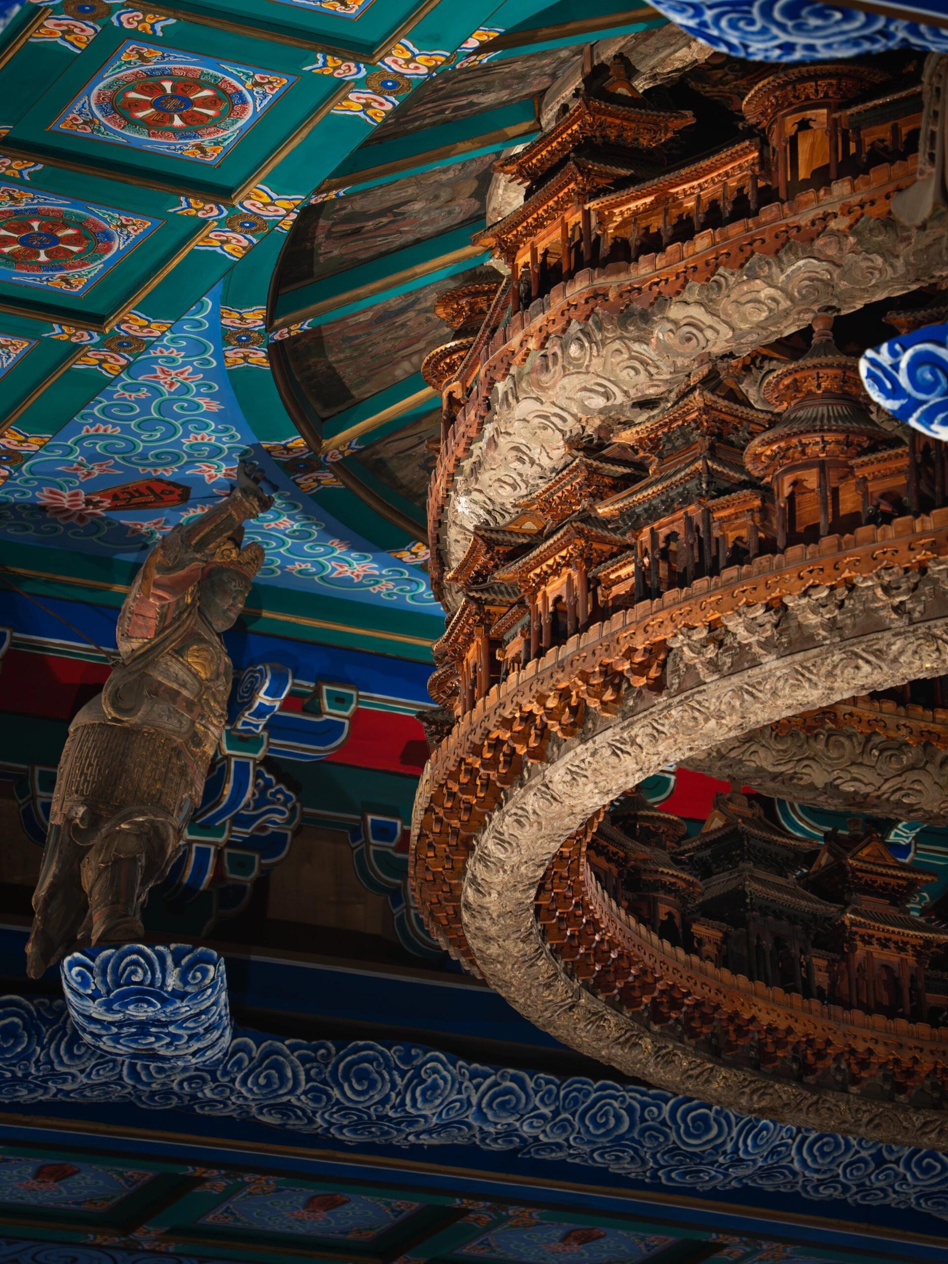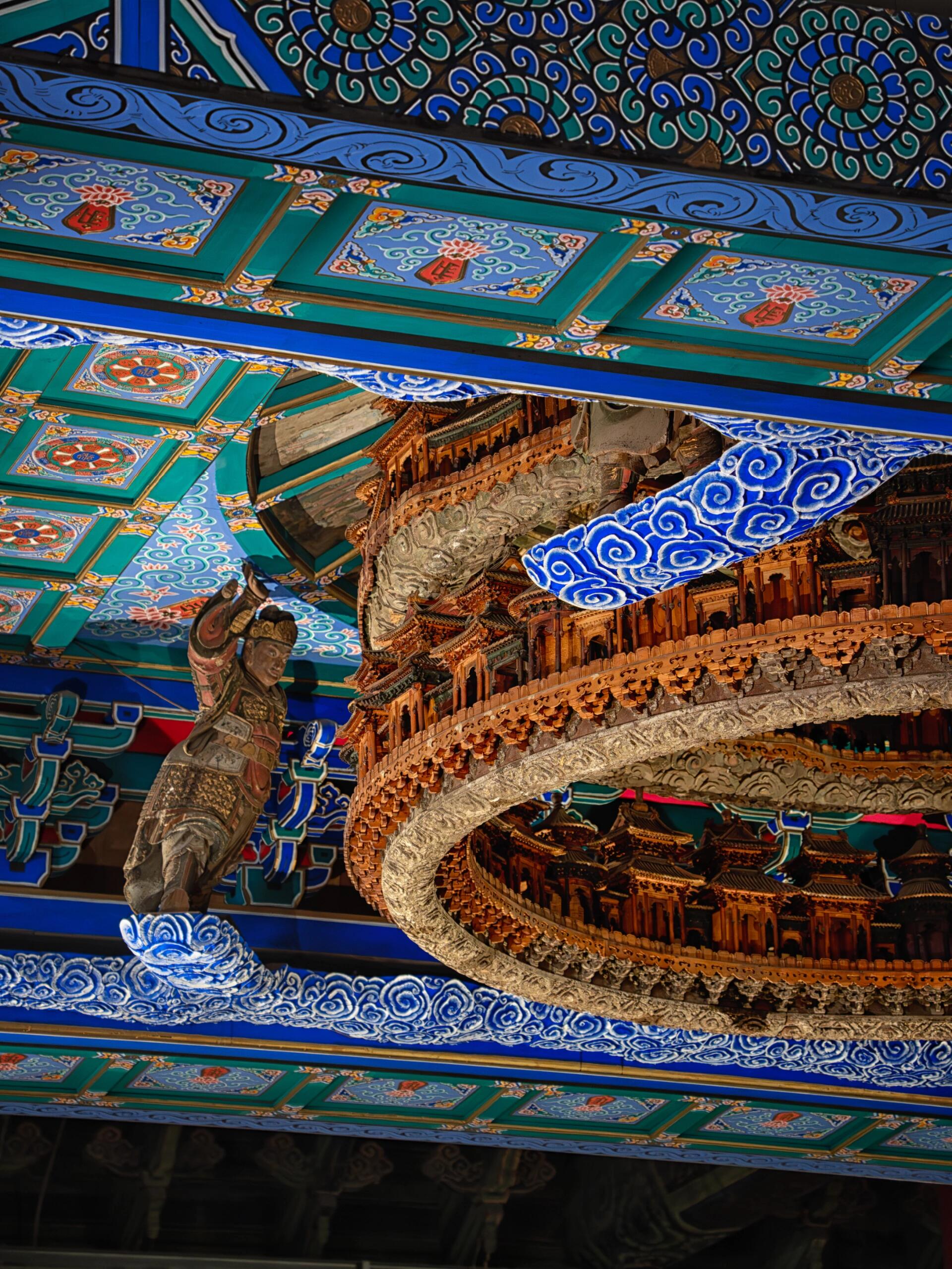 往上细看,藻井的上层空间构造更为精妙。每一层都建有微型楼阁,飞檐翘角,雕梁画栋,楼阁之间以廊道相连,形成四通八达的立体空间。这些楼阁并非装饰性的摆设,据说每个阁中都曾供奉佛像,虽历经岁月流失,部分佛像已不复存在,但从残留的佛龛痕迹仍能想象当年的庄严景象。佛像的朝向也颇有讲究,均呈向下俯瞰的姿态,仿佛在凝视众生,传递着慈悲与智慧。
