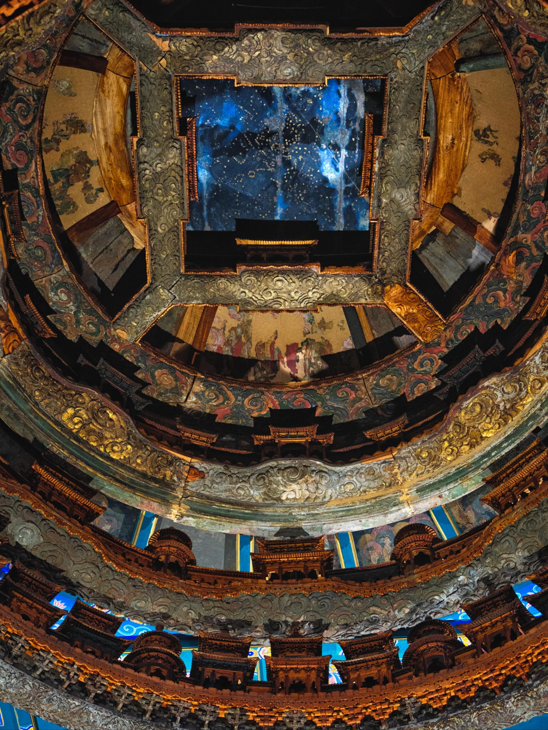 星空图是藻井最令人着迷的部分。那些镶嵌在穹顶的星斗,并非随意点缀,而是依据千百年前的实际天象绘制。黯淡的银河在穹顶流淌,星座的位置与古籍记载一一对应,仿佛将浩瀚宇宙压缩进这一方天地。在没有天文望远镜的时代,古人凭借肉眼观测和世代相传的星图知识,将星空复刻得如此精准,这份对自然的敬畏与探索精神,透过斑驳的木质表面扑面而来。