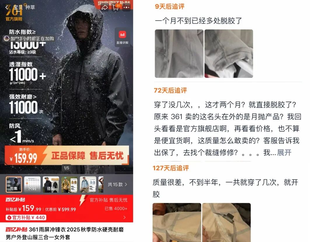 零售独立评论人马岗则指出,从部分消费者反馈的穿着体验、设计细节及开胶等问题来看,361度在冲锋衣产品的准备上可能不够充分。这反映出品牌在供应链管理、品控以及基于市场反馈的产品迭代优化上,仍需时间完善。
