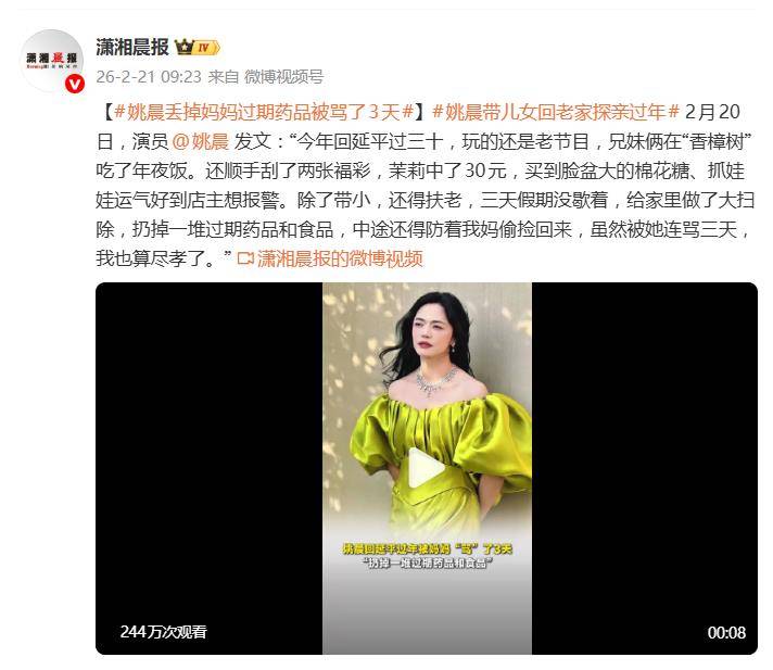 这个春节,演员姚晨回福建延平老家,干的“头等大事”不是走亲访友,而是跟亲妈上演了一出“清理与反清理”的拉锯战。她趁着大扫除,扔掉家里一堆过期药品和食品,结果被节俭成习惯的母亲连续骂了三天,还得时刻提防老妈偷偷把东西捡回来。姚晨一句“虽然被她连骂三天,我也算尽孝了”的幽默总结,瞬间戳中了无数过年回家年轻人的痛点,话题直接冲上热搜。