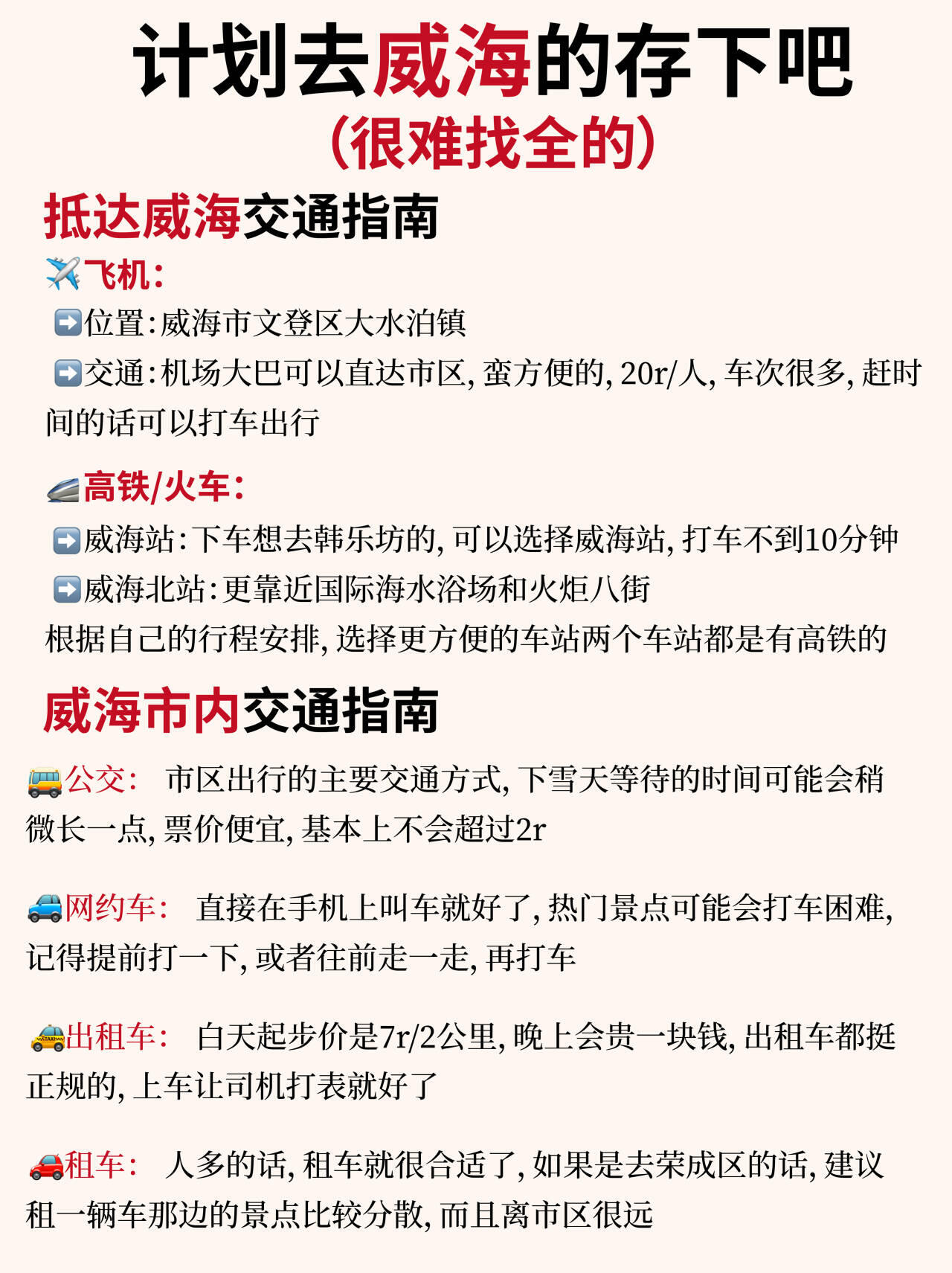 ✅机场只有威海大水泊机场✈️,离市区大概40多公里✅火车站有威海站和威海北站,威海站靠近韩乐坊,威海北站靠近国际海水浴场🌊
