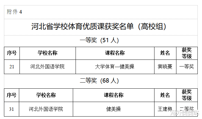近日,河北省教育厅公布2025年高校体育优质课评选结果,河北外国语学院窦晓蔓老师的《大学体育-健美操》课程荣获一等奖,王