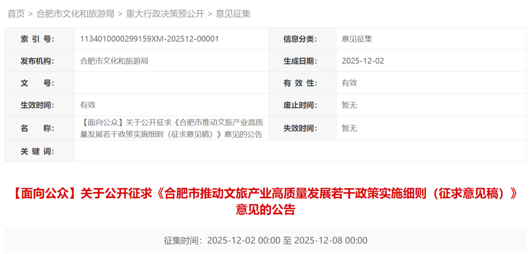 12月2日,合肥市文化和旅游局发布《合肥市推动文旅产业高质量发展若干政策实施细则(征求意见稿)》。