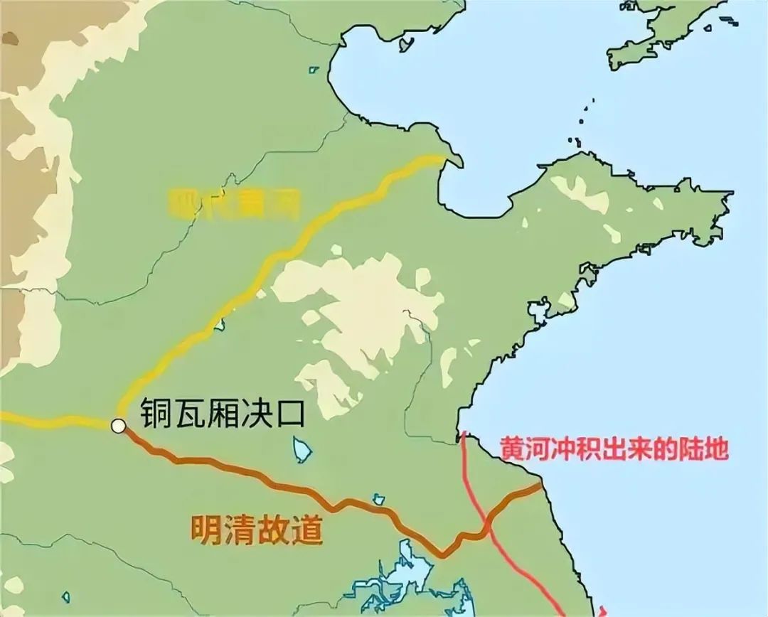 黄河最开始向北流,然后再向东流,这一次是向南流了。黄河至此由北入渤海改而为在南边流入黄海。