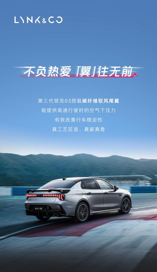 第三代领克03的碳纤维驭风尾翼,从赛道技术中汲取灵感进行优化。其采用东丽碳丝材料搭配240gsm3K斜纹预浸料打造,这种常用于赛车部件的材质,既保证了尾翼的轻量化与高强度,又让表面呈现出细腻的3D编织纹理,视觉上传递出强烈的赛事基因。在功能设计上,尾翼倾斜角度参照赛车空气动力学标准反复调校,精准适配车身流线,高速行驶时能引导气流避开车身尾部涡流,减少风阻的同时为后轮提供额外下压力——这一设计与赛事中提升赛车操控稳定性的逻辑一致,让日常驾驶也能拥有接近赛道级的车身稳定性,变道超车更从容,雨天湿滑路面行驶也更安全。
