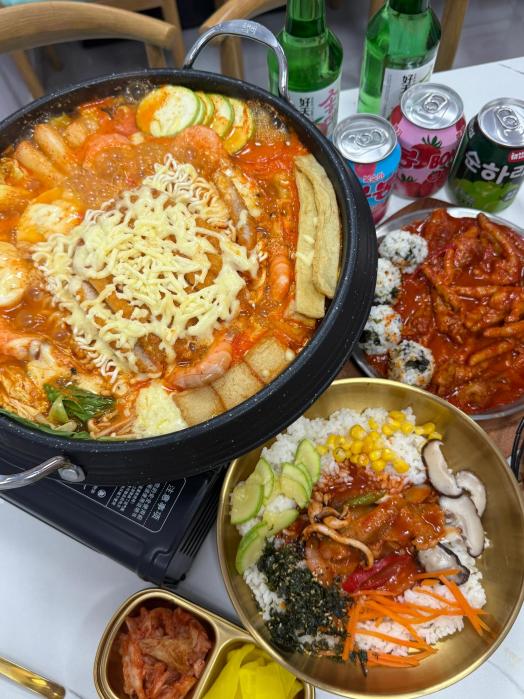他们家的部队锅和芝士年糕锅是招牌,汤底浓淡适中,食材给得实在,午餐肉、鱼饼、辛拉面这些经典配菜都有。喜欢芝士的可以加份芝士,煮化后裹着年糕吃很过瘾。