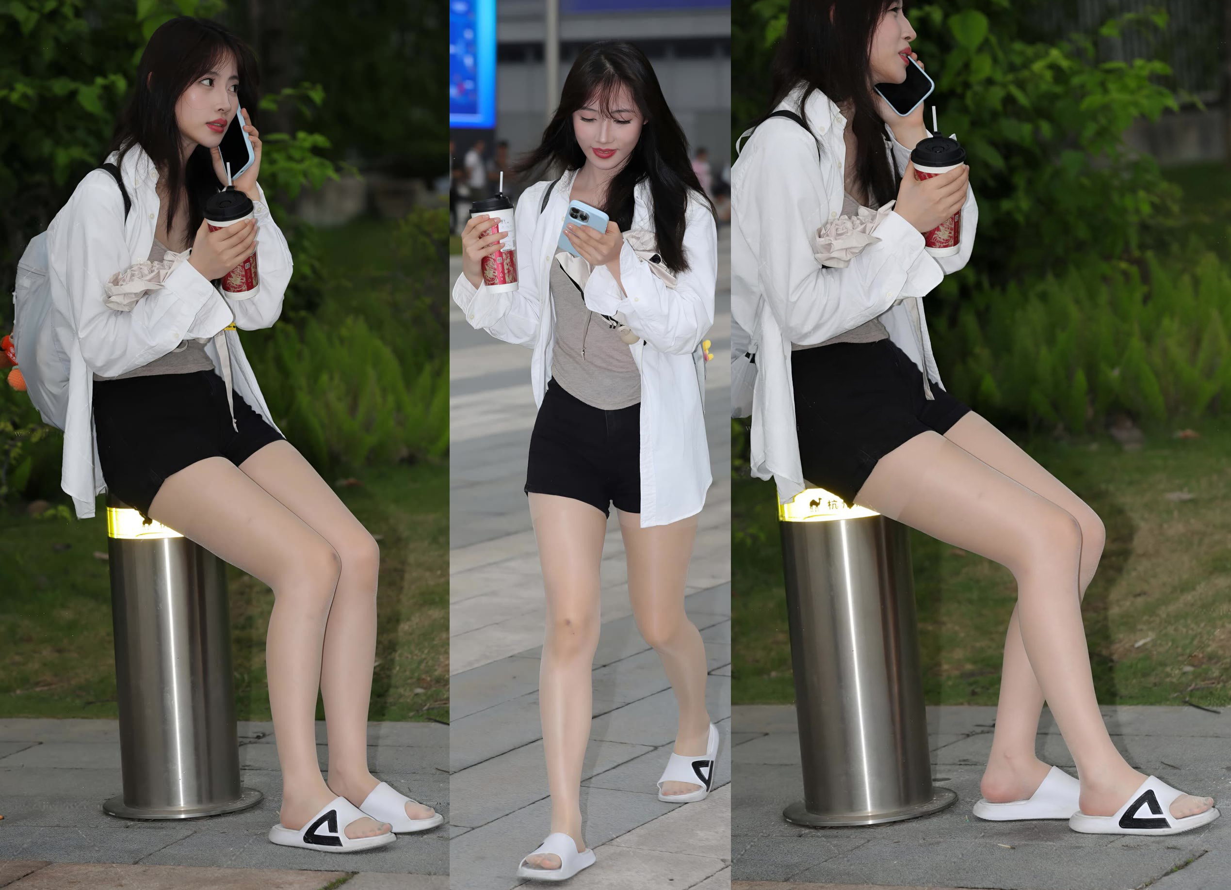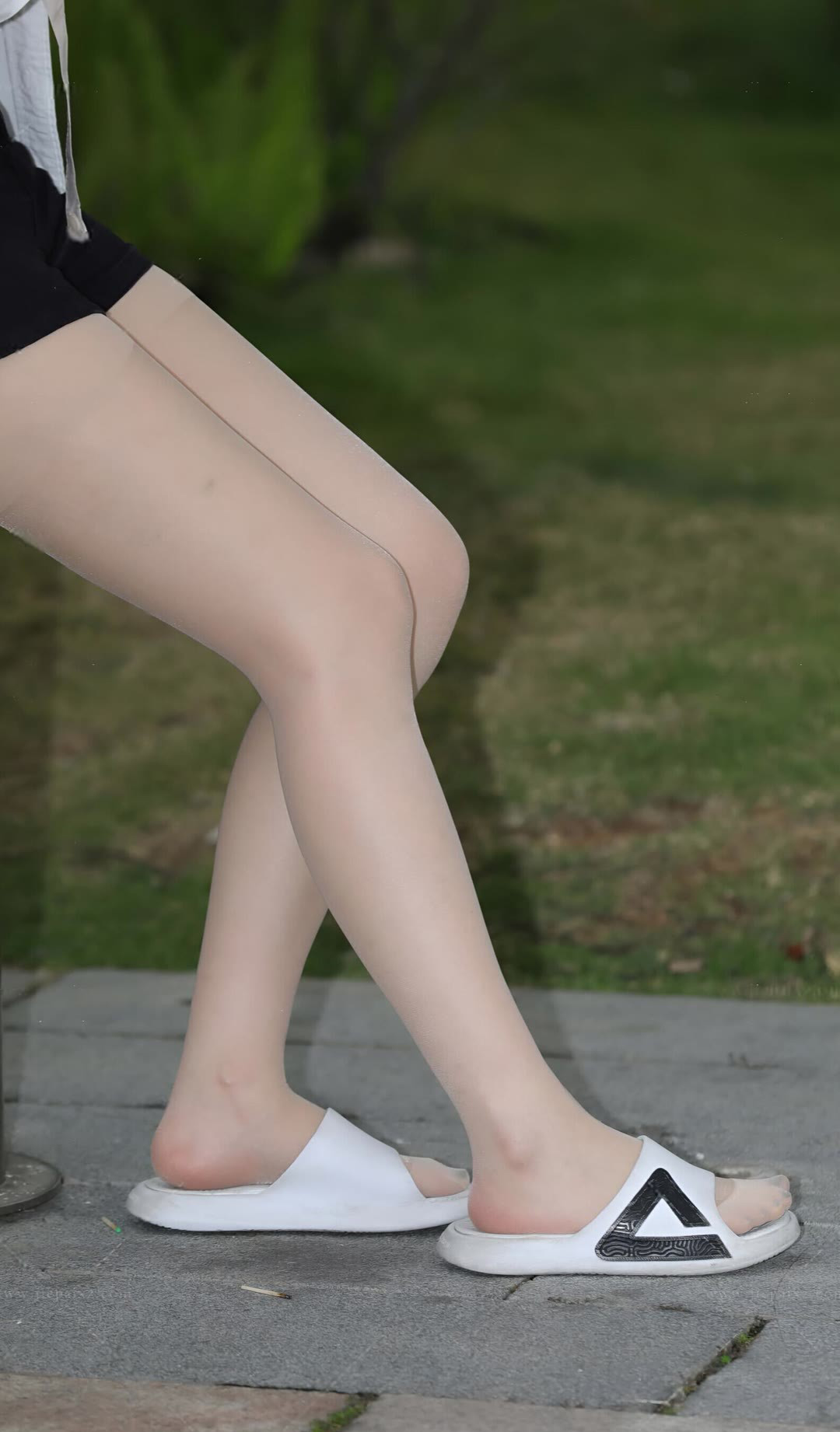 起初吸引我的,是那一抹流动的光泽。她倚在路边的栏杆上,简单的运动上衣,利落的短裤。而最夺目的,是那双裹着油亮肉色丝袜的腿——那不是日常的哑光,而是一种液态的、近乎釉质的光感,将傍晚最浓烈的那束斜阳,完完整整地接住,再折射成一片暖融融的辉晕。光线沿着她微曲的小腿线条流畅地爬升,在膝盖处绷出细腻的、几乎看不见的褶皱,又在脚踝处收束,没入一双白色的厚底运动鞋里。