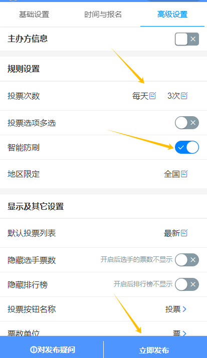 设置时间:可设定开始/结束时间,还可开启分组投票及报名模式(按需求设置)