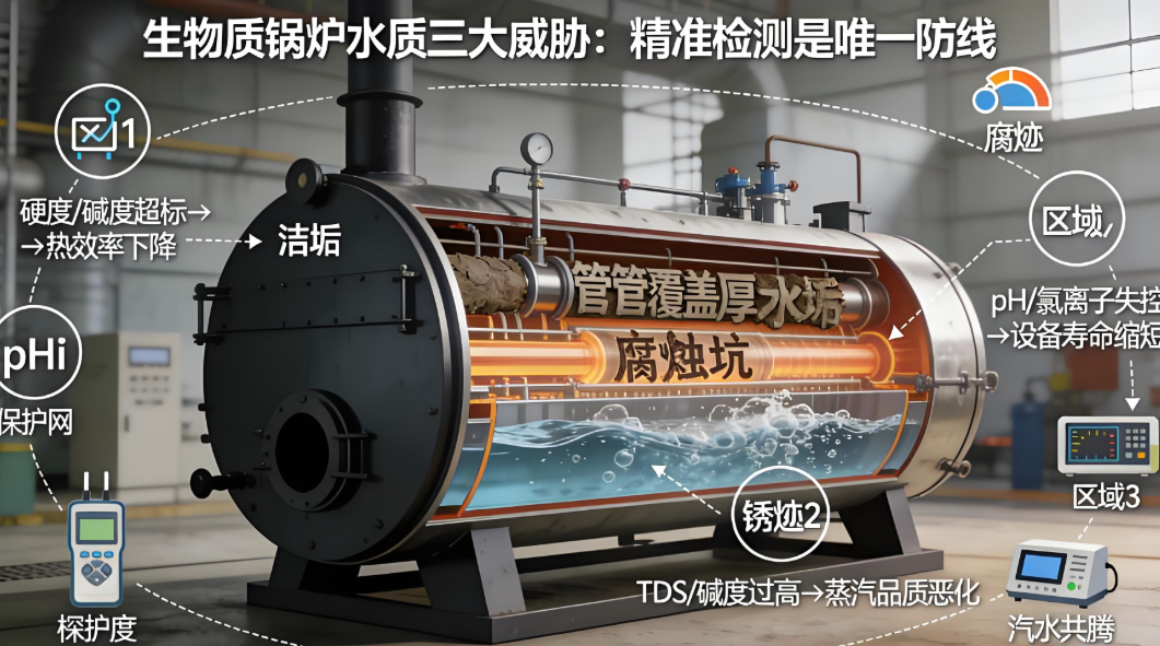 氯离子:生物质燃料含氯量较高,易导致水体氯离子富集,破坏金属钝化膜引发点蚀,国标限值≤20mg/L。