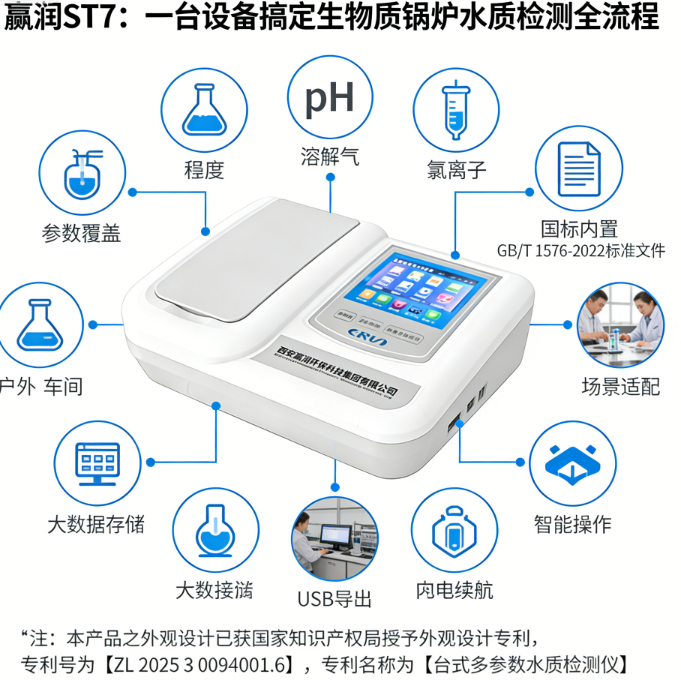 针对生物质锅炉水质波动大、检测场景多样的痛点,赢润ST7便携式多参数水质检测仪实现了“精准、高效、适配工况”的核心需求,成为行业运维优选设备。其核心优势体现在:一是参数全覆盖,可同步检测硬度、pH、溶解氧、氯离子、总碱度等核心指标,无需多台设备拼凑;二是国标全兼容,内置GB/T 1576-2022标准曲线,数据可直接用于合规报告与运维记录;三是场景适配性强,防水防摔设计适配工业现场环境,内置锂电池续航10小时,满足移动巡检需求;四是操作智能化,中文大屏引导式操作,自动完成显色、计算,支持9.9万条数据存储与USB导出,非专业人员经培训即可上手。无论是小型生物质蒸汽锅炉的日常自检,还是大型锅炉的应急检测,赢润ST7都能精准匹配需求,提升检测效率与管控水平。