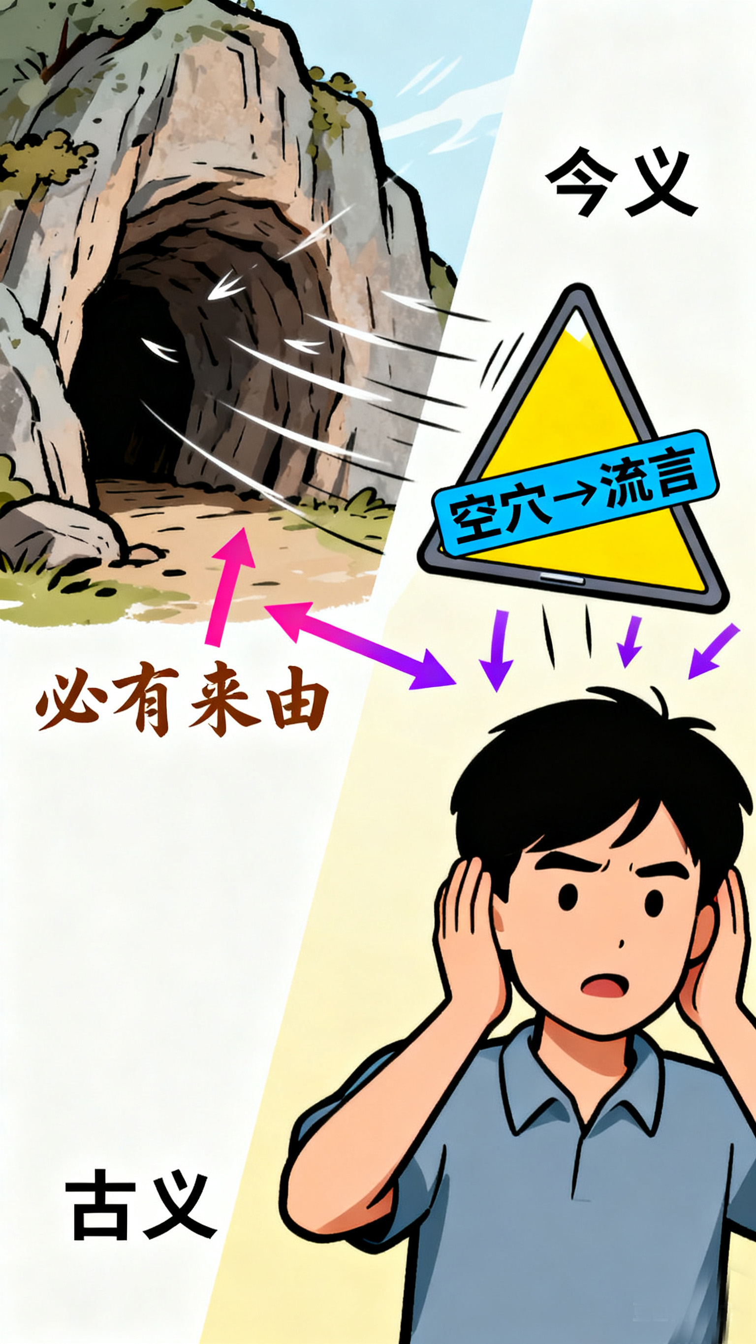古义:比喻消息和传闻的产生都是有原因和根据的。因为有了空穴,才会招来风。出自宋玉《风赋》:“臣闻于师:枳句来巢,空穴来风。”