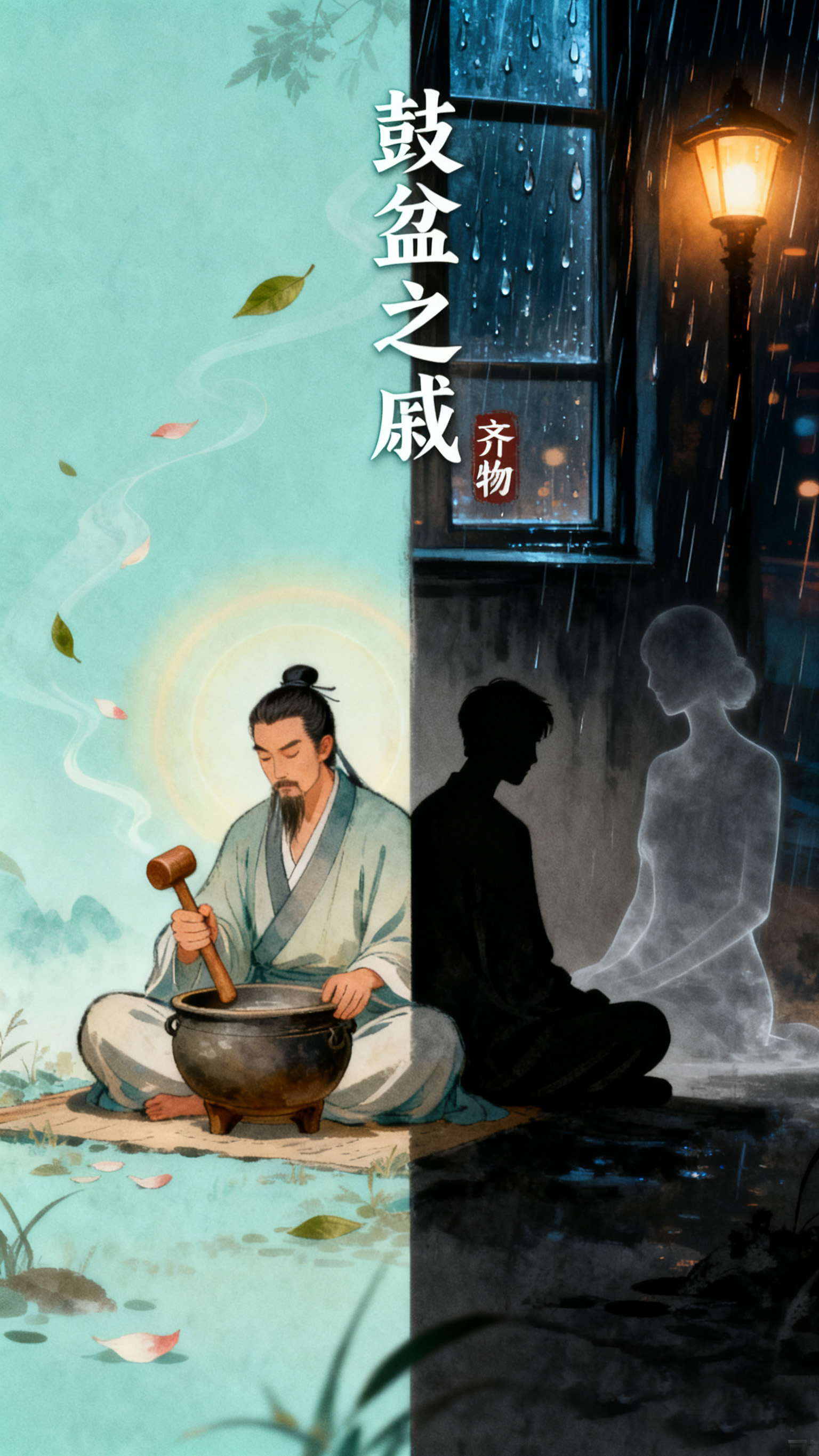 古义:庄子在妻子死后"鼓盆而歌",体现其通达的生死观。出自《庄子·至乐》,讲的是庄子的妻子死了,好友惠子前去吊唁,看到庄子正岔开腿坐着(一种不拘礼节的坐姿),一边敲打瓦盆一边唱歌。