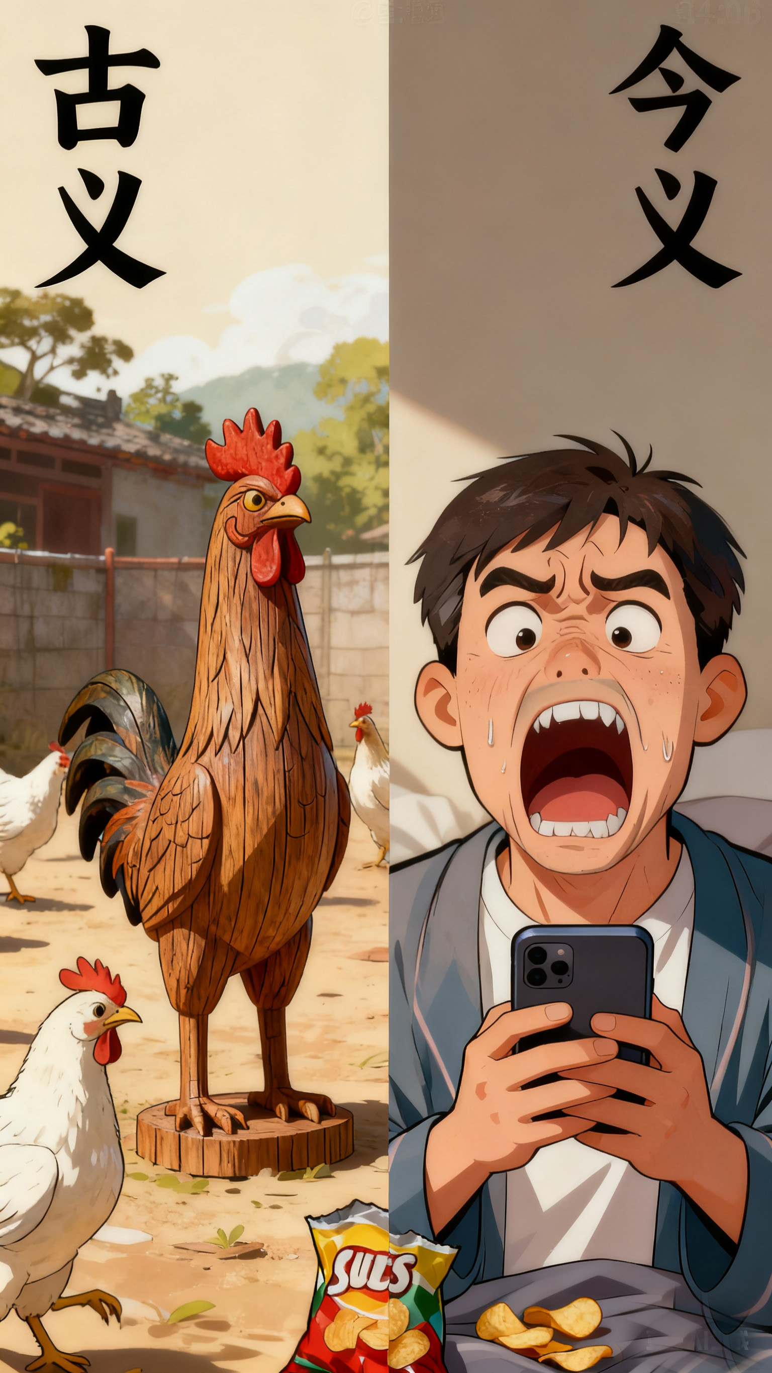 古义:形容修养达到最高境界、镇定自若、精神凝寂的样子。出自《庄子·达生》,讲一个训练斗鸡的过程,最好的境界是鸡听到别的鸡叫毫无反应,“望之似木鸡矣”,别的鸡一看就不敢跟它斗了。