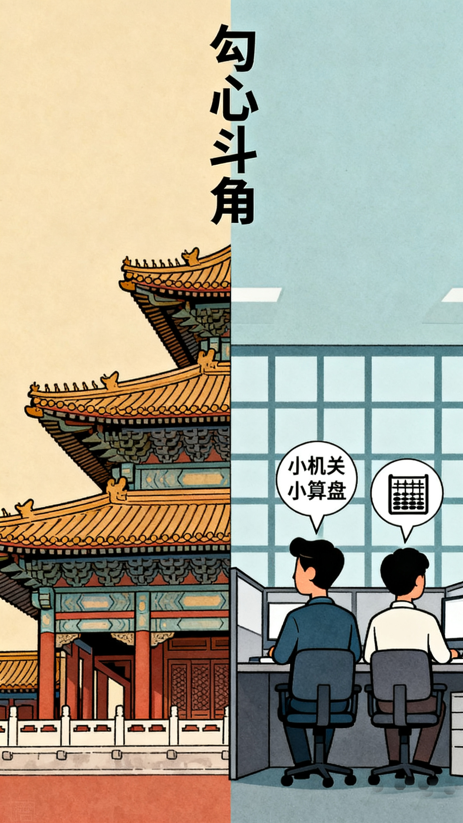 古义:形容宫室建筑结构的交错和精巧。心,指宫室的中心;角,指檐角。出自杜牧《阿房宫赋》:“各抱地势,钩心斗角。”