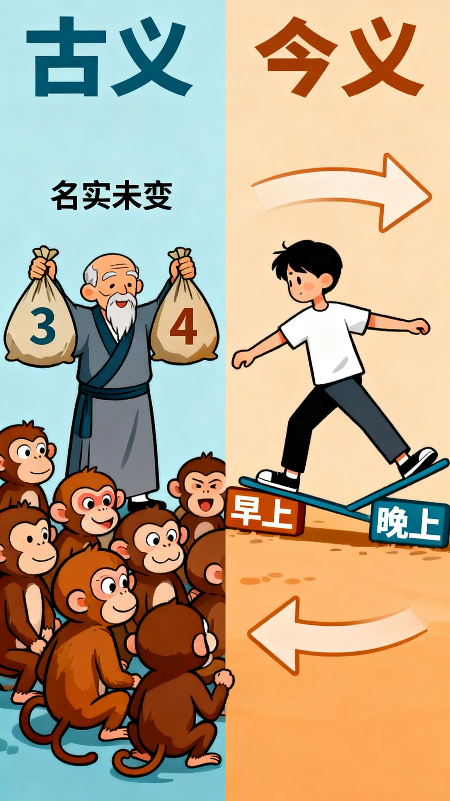 古义:指用诈术欺骗人,但本质没有改变。源自《庄子·齐物论》:诳之曰:“与若芧,朝三而暮四,足乎?”众狙皆起而怒。俄而曰:“与若芧,朝四而暮三,足乎?”众狙皆伏而喜。今义:形容人反复无常,经常变卦,感情不专一。