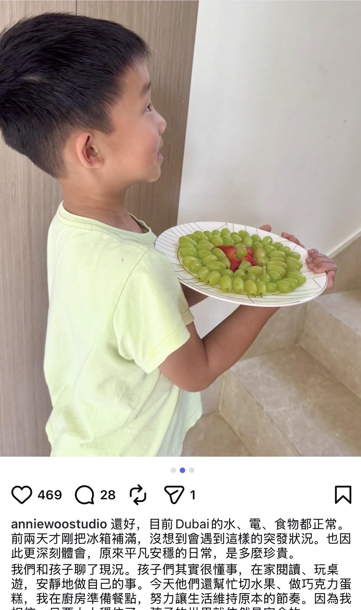 她在自己的社交账号上发了几条消息,向关心她的朋友和粉丝报平安。 她说全家都安全,迪拜目前水电食物供应正常,超市补货也及时。 她说孩子们开始上网课了,希望周三之后能平安回到校园,城市能恢复平静。 她写了一句:“从没想过,我们也会亲身经历导弹拦截与震耳的巨响,但此刻能做的,就是照顾好家人、守好生活,让爱与陪伴成为彼此最坚定的力量。 ”