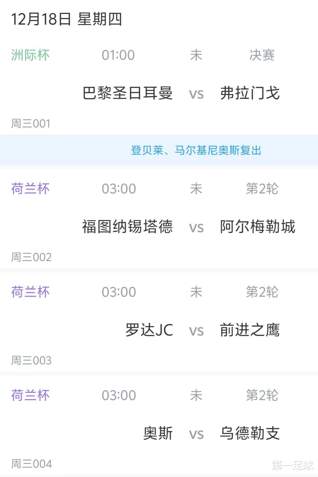 今晚重点有7场比赛,洲际杯决赛,巴黎圣日耳曼VS弗拉门戈,这场两队都重视,毕竟也是个世界冠军么。英联杯打到了1/4决赛,赢了就进半决赛了,强队们可能做些轮换,但也不是说完全不重视,相对来说荷兰杯因为也是第2轮,爆冷概率最高。