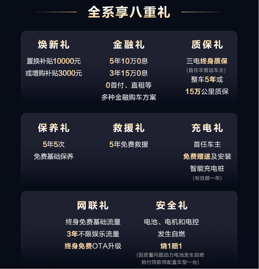第八重,安全礼:电池、电机和电控发生自燃,烧1赔1(因质量问题动力电池发生自燃赔付同款同配置车型一台)。