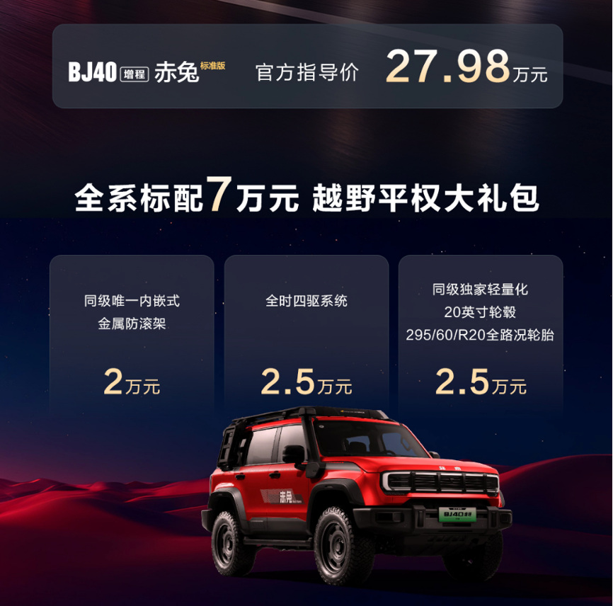 BJ40增程赤兔标准版官方指导价27.98万元!购车即可享有价值7万元的“越野平权大礼包”,包含价值2万元的同级唯一内嵌式金属防滚架、价值2.5万元的全时四驱系统和价值2.5万元的同级唯一轻量化20英寸轮毂与295/60 R20全路况轮胎。