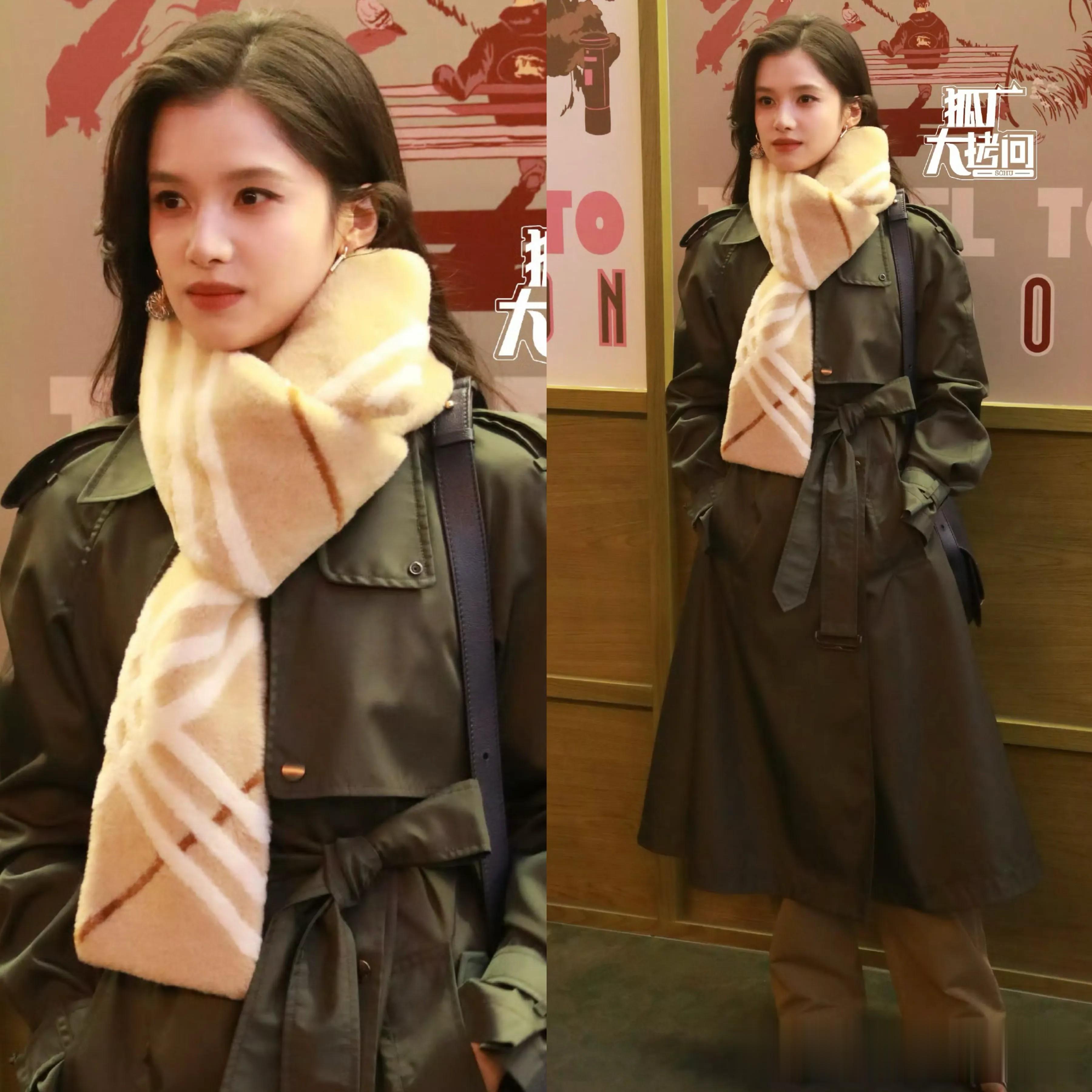作为95花里以端庄大气著称的她,今晚依旧发挥稳定,一身墨绿色风衣搭配围巾相当有千金风,微卷的长发更是为她增添了一份妩媚。