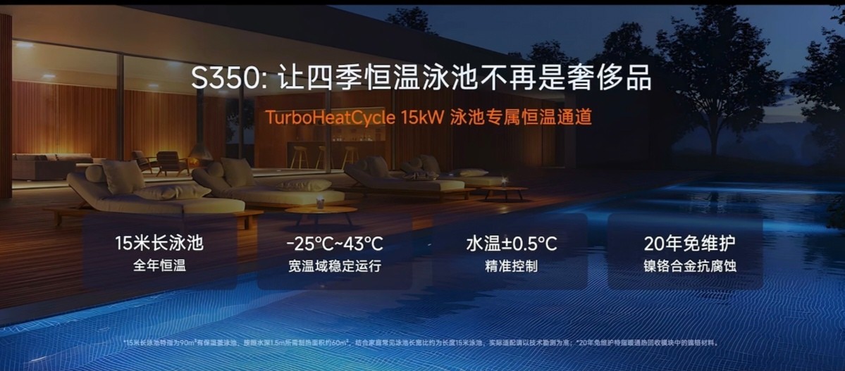 在具体性能表现上,S350的热回收效率达到100%,可完全替代传统燃气热水器与泳池加热设备。针对高端住宅的多人用水场景,其热水供应能力堪称“澎湃”——可同时满足15个热水点的用水需求,即使3个200L的浴缸同时注水也能轻松应对,彻底解决了传统系统热水供应不足、等待时间长的痛点。S350的综合能效比达1:5.6,远超国家一级标准,甚至可以在光照充足时实现零电费制冷供暖。