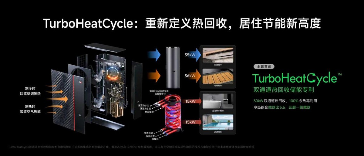 首先,作为集成空调极致舒适体验的代表,S350以“热泵+热回收”技术为核心,实现了从“功能叠加”到“舒适中枢”的升级,为高端用户打造了全场景的无感舒适体验。其核心技术支撑是欧瑞博自研的TurboHeatCycle™双通道热回收储能专利,这一技术从底层重构了能源利用逻辑——夏季将空调制冷产生的废热转化为免费的生活热水与泳池热能,冬季通过热泵技术高效汲取空气能,驱动地暖、生活热水和恒温泳池运行,实现“一份能源、四重利用”的高效循环。