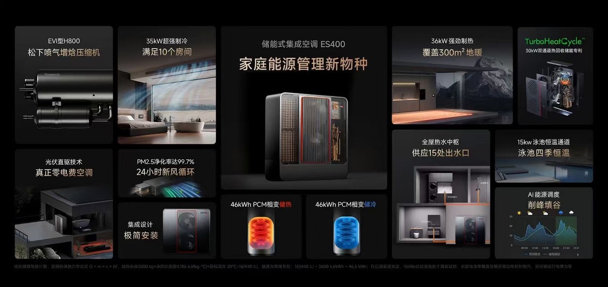如果说S350是舒适中枢的极致呈现,那么ES400则以“储能+AI调度”技术为核心,实现了从“舒适中枢”到“能源中枢”的革命性突破,成为全球首款采用PCM相变储能技术的家用储能式集成空调。