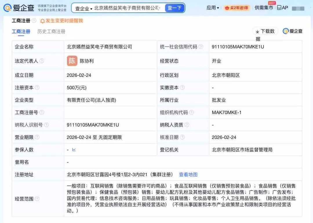 爱企查App显示,近日,北京嫣然益笑电子商贸有限公司成立,法定代表人为陈协利,注册资本500万元人民币,经营范围包括互联网销售、婴幼儿配方乳粉及其他婴幼儿配方食品销售等,由北京微笑守护医疗科技有限公司全资持股。